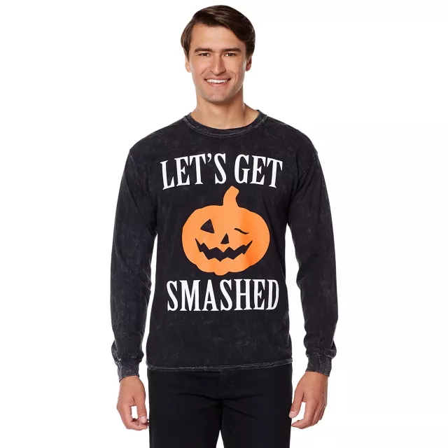 Who needs a costume? Let everyone know why you really came to the Halloween party when you wear this hilarious "Let's Get Smashed" long sleeve t shirt! This long-sleeved shirt is absolutely perfect for any fun and casual Halloween celebration.