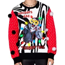 The holidays can be killer. Why not rock a sweater to match? Sport a slasher-chic holiday look with this officially licensed Light-Up Art the Clown Holidays are Terrifying Christmas Sweater! Designed with retro-style string lights, sewn-on tinsel pom-poms, and a chilling Art the Clown graphic, this sweater will have all eyes on you this Christmas.