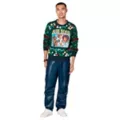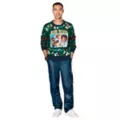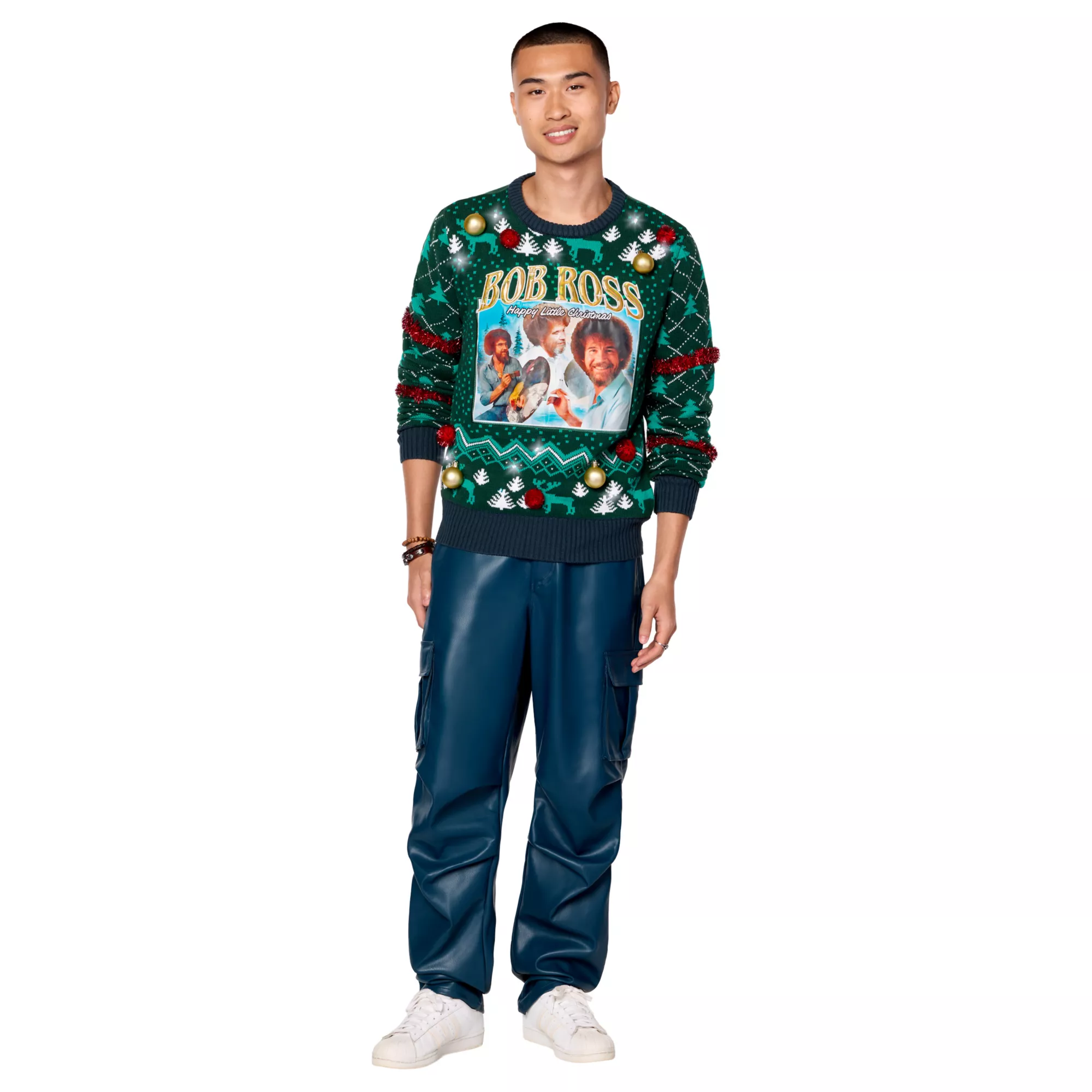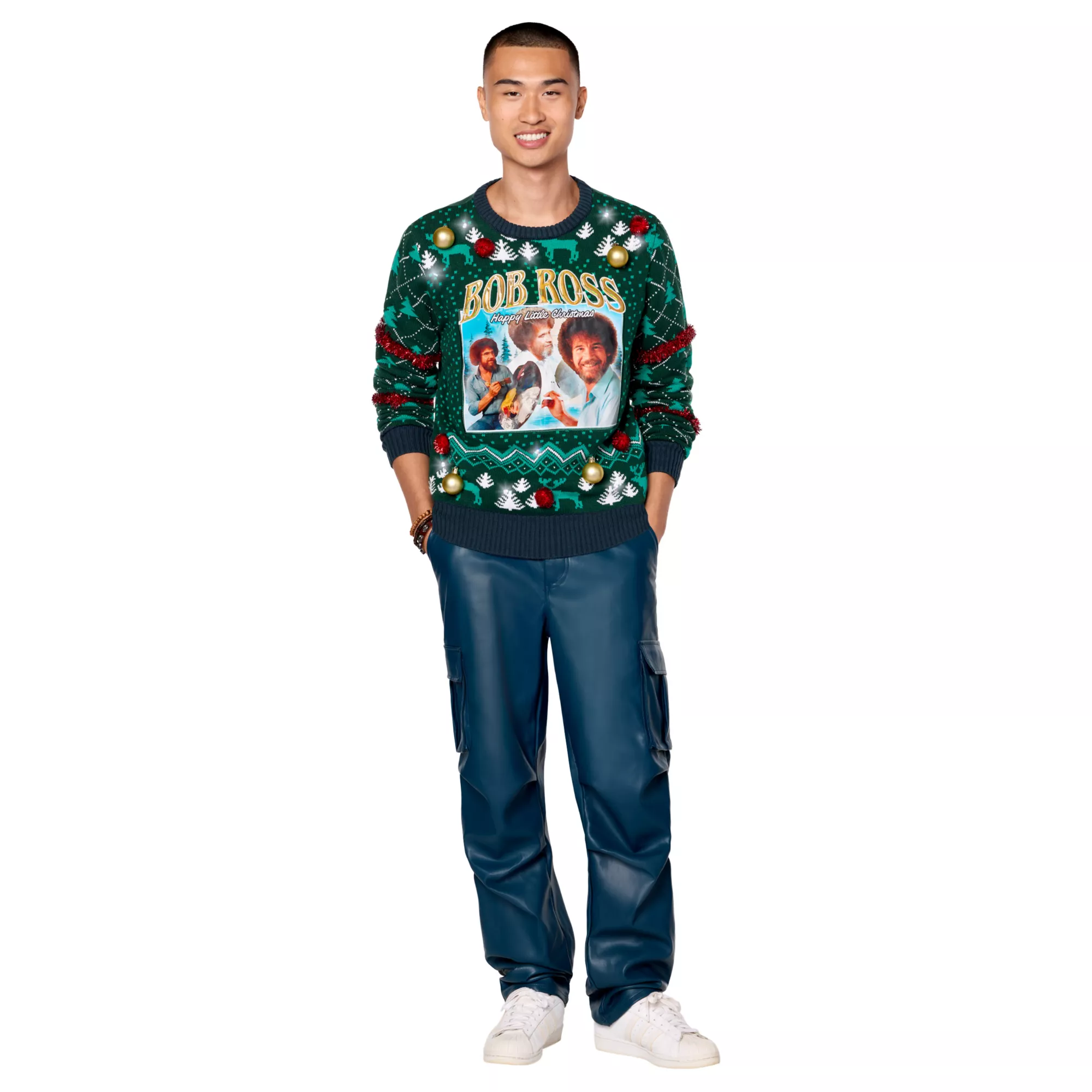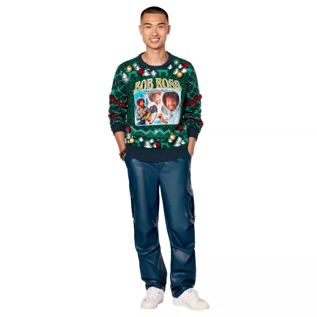 Have a "Happy Little Christmas" and paint the holidays bright with this officially licensed Light-Up Bob Ross Christmas Sweater. Featuring the legendary Bob Ross surrounded by twinkling lights, snowy trees, and just a few "happy little accidents," this masterpiece will turn heads at any holiday gathering!