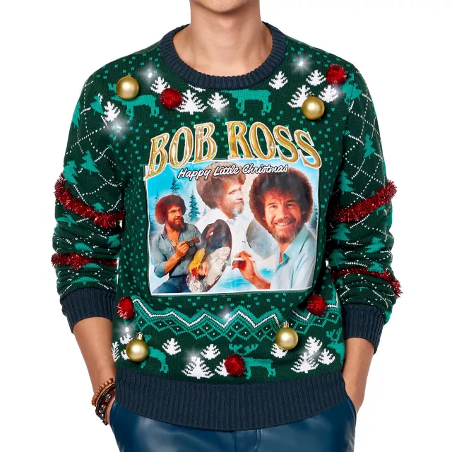Have a "Happy Little Christmas" and paint the holidays bright with this officially licensed Light-Up Bob Ross Happy Little Christmas Sweater. Featuring the legendary Bob Ross surrounded by twinkling lights, snowy trees, and just a few "happy little accidents," this masterpiece will turn heads at any holiday gathering!