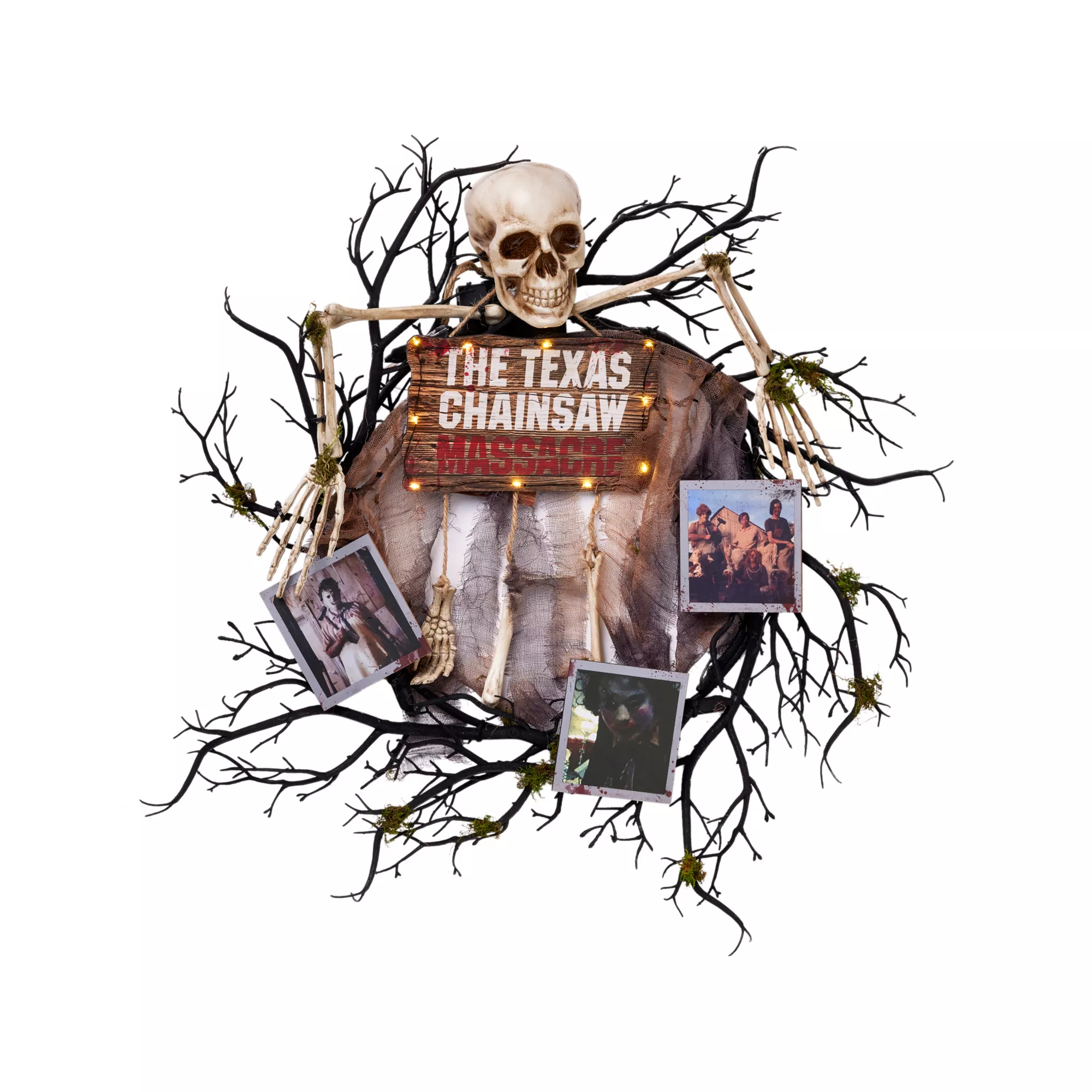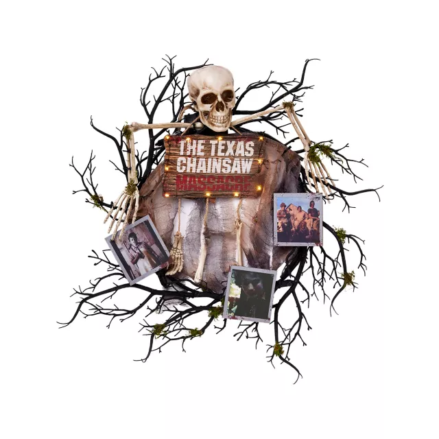 The sound of that chainsaw revving is enough to scare just about anyone. Represent your favorite horror villain and let everyone know you're a slasher-master when you hang this officially licensed Light-Up Leatherface Wreath!