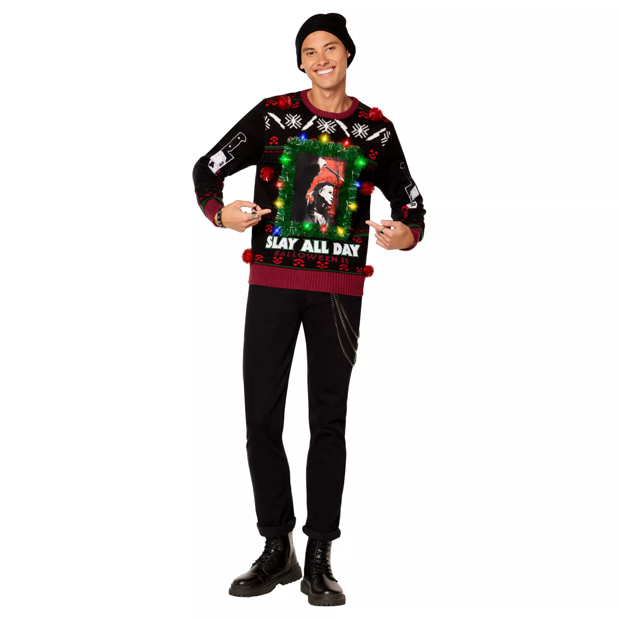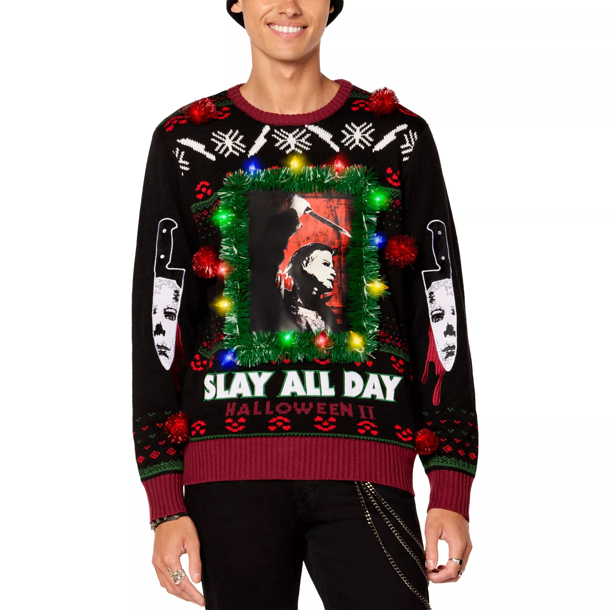Bundle up with Michael Myers! This black Halloween II Christmas sweater features a ferociously festive knife print, blood-red tinsel poms, a large Michael Myers chest graphic, and colorful holiday lights. This cozy sweater makes a great gift for the ho-ho-horror lover in your life.