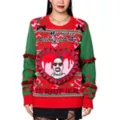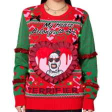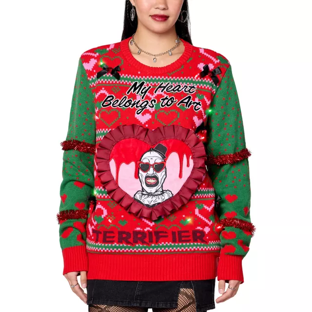 If there's one thing we learned from Terrifier 3, it's that Art the Clown loves spreading some Christmas cheer! Show love for your favorite villain when you rock this officially licensed Light-Up My Heart Belongs to Art Christmas Sweater. Inspired by the Terrifier franchise, this sweater features bows, jingle bells, garland, three light-up settings, and an image of Art that'll melt the hearts of horror fans.