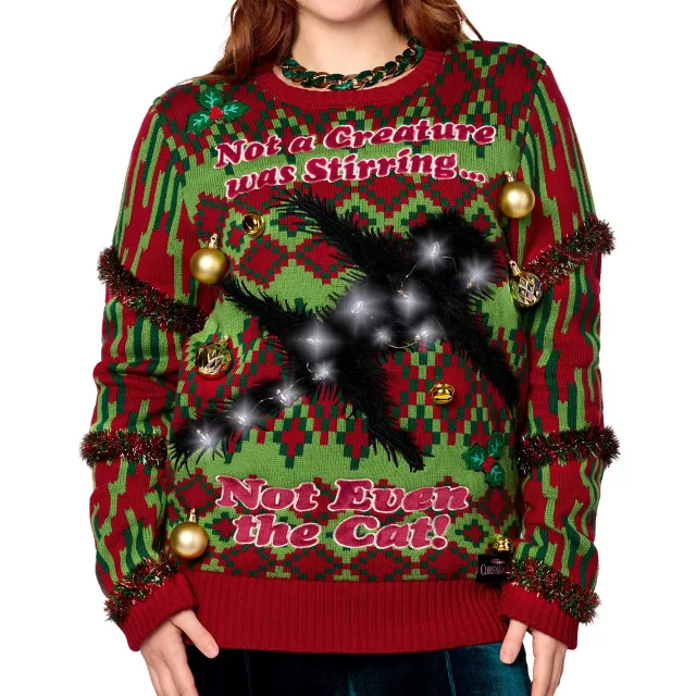 It's not Christmas until someone fries the cat! Rep your favorite holiday movie with this officially licensed National Lampoon's Christmas Vacation Cat Christmas Sweater. This light-up sweater features Aunt Bethany's poor feline mid-zap! With tangled lights and puffed-up fur, this sweater brings the perfect amount of chaos to any holiday party.