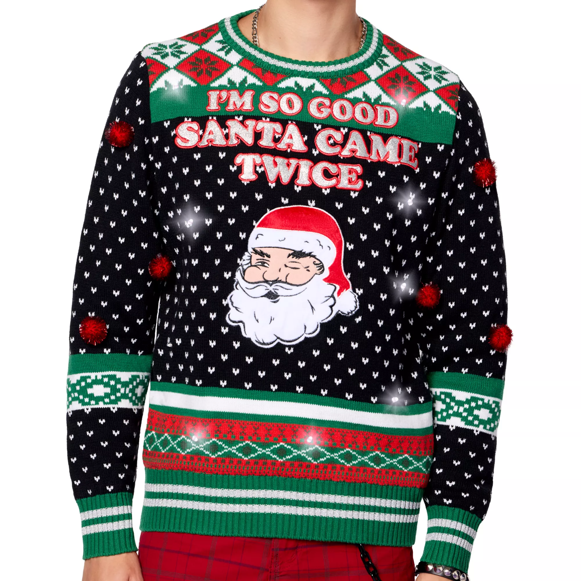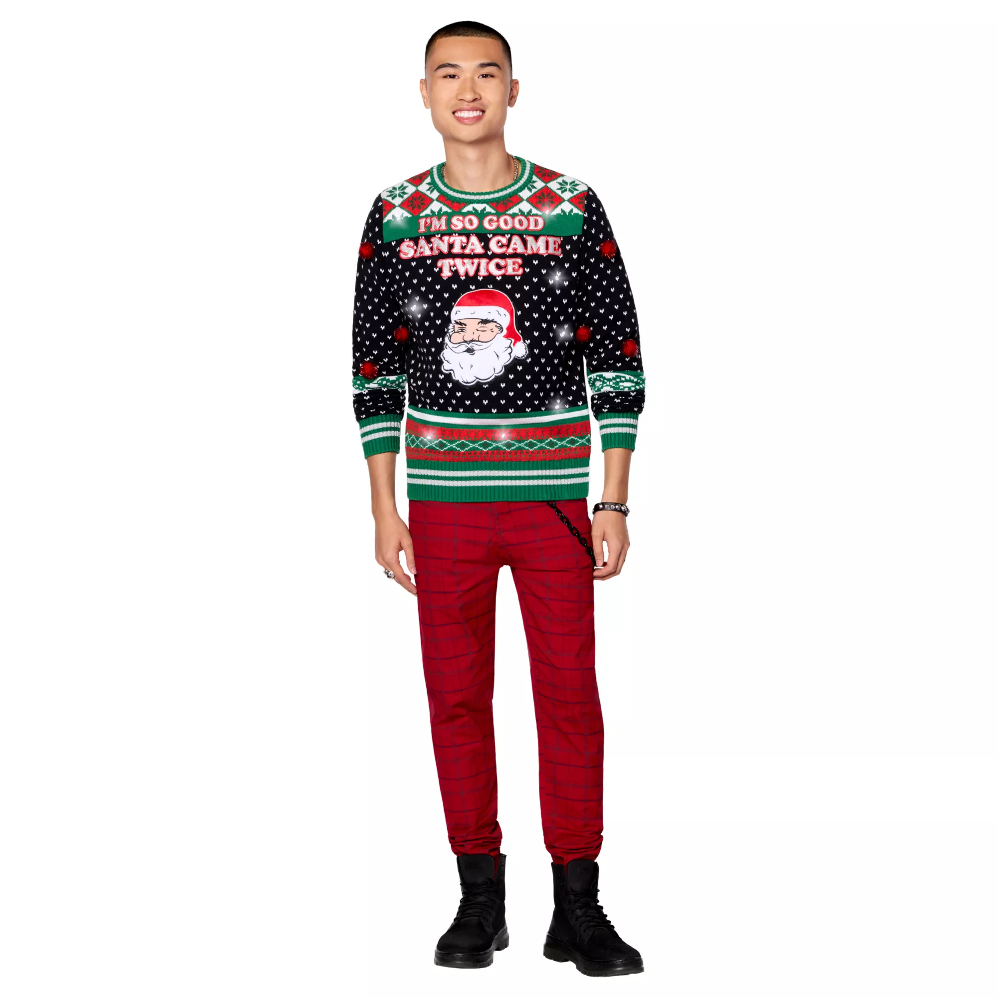 Santa may have had one too many eggnogs. Shock your family and friends when you show up to Christmas dinner in this officially licensed Light-Up Santa Came Twice Christmas Sweater. Part of the always outrageous Danny Duncan collection, this sweater brings the chaos with red and green accents, eight light-up patterns, a jolly image of Santa, and an unforgettable message bound to spread some holiday cheer.