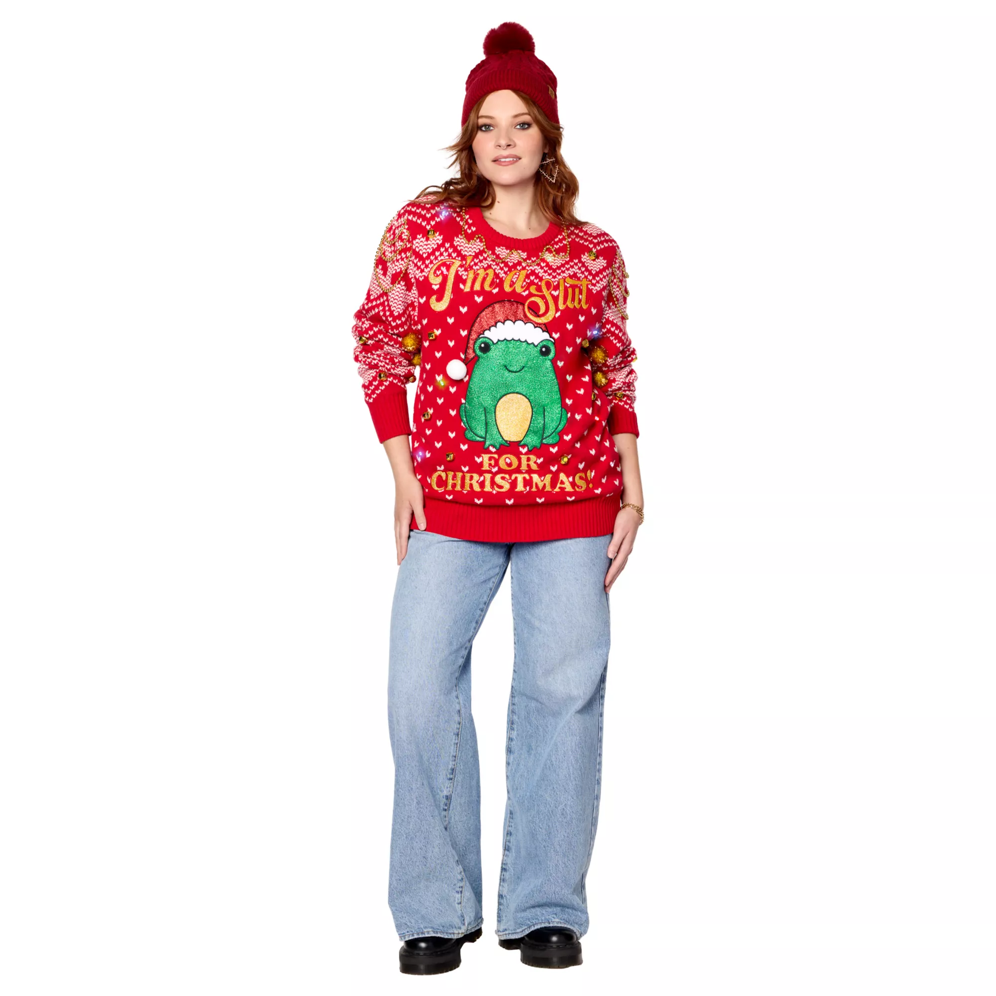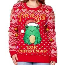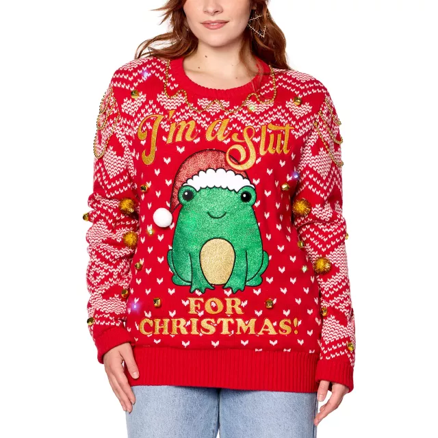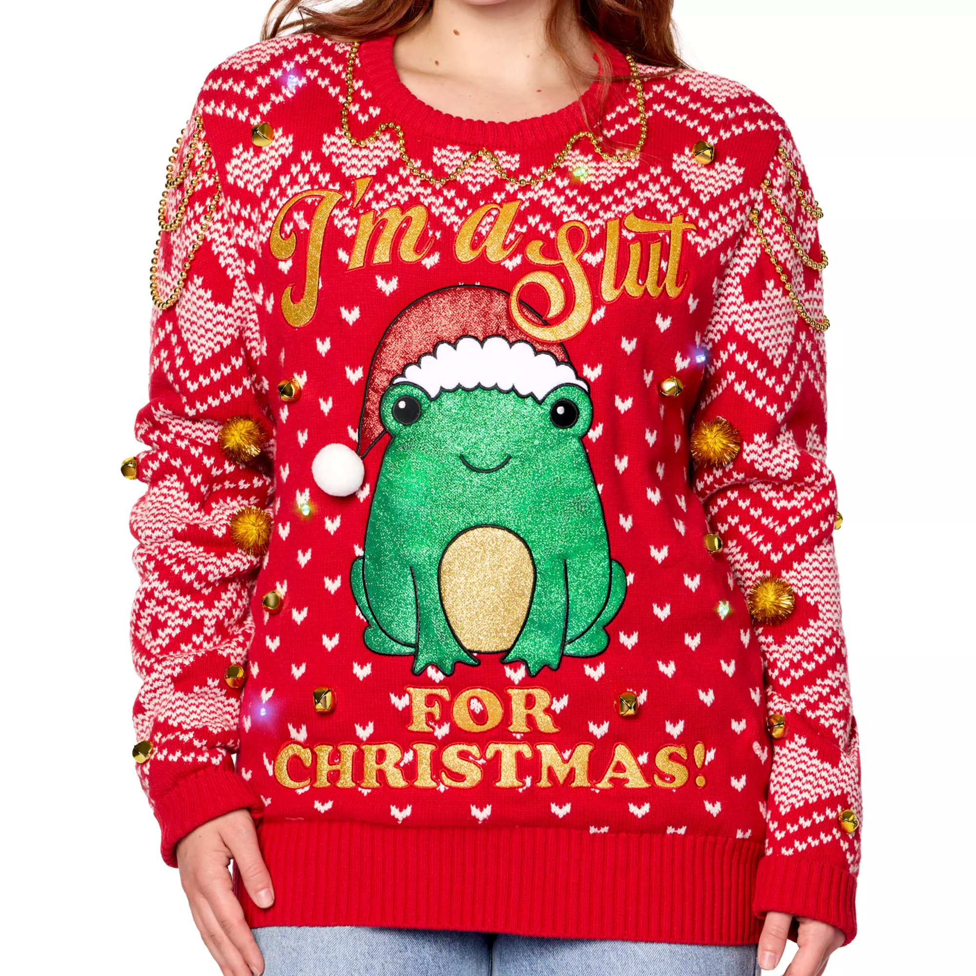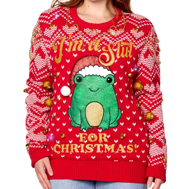 Get ready to sleigh the holiday season in this naughty sweater! Featuring a cute festive frog and twinkling lights, this Slut for Christmas Frog Sweater is perfect for your next holiday party.