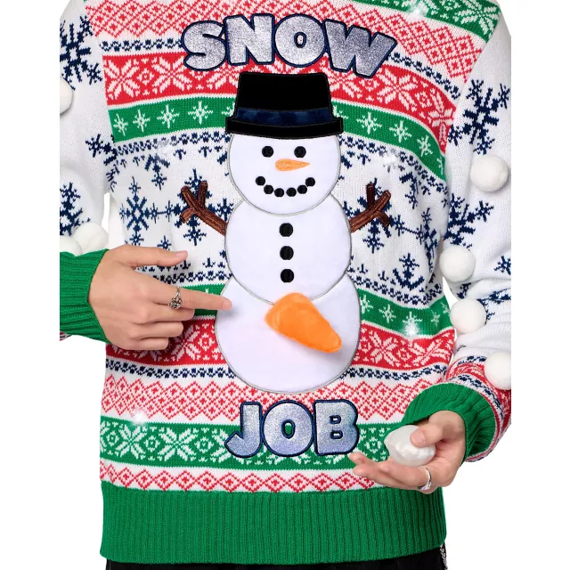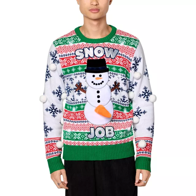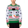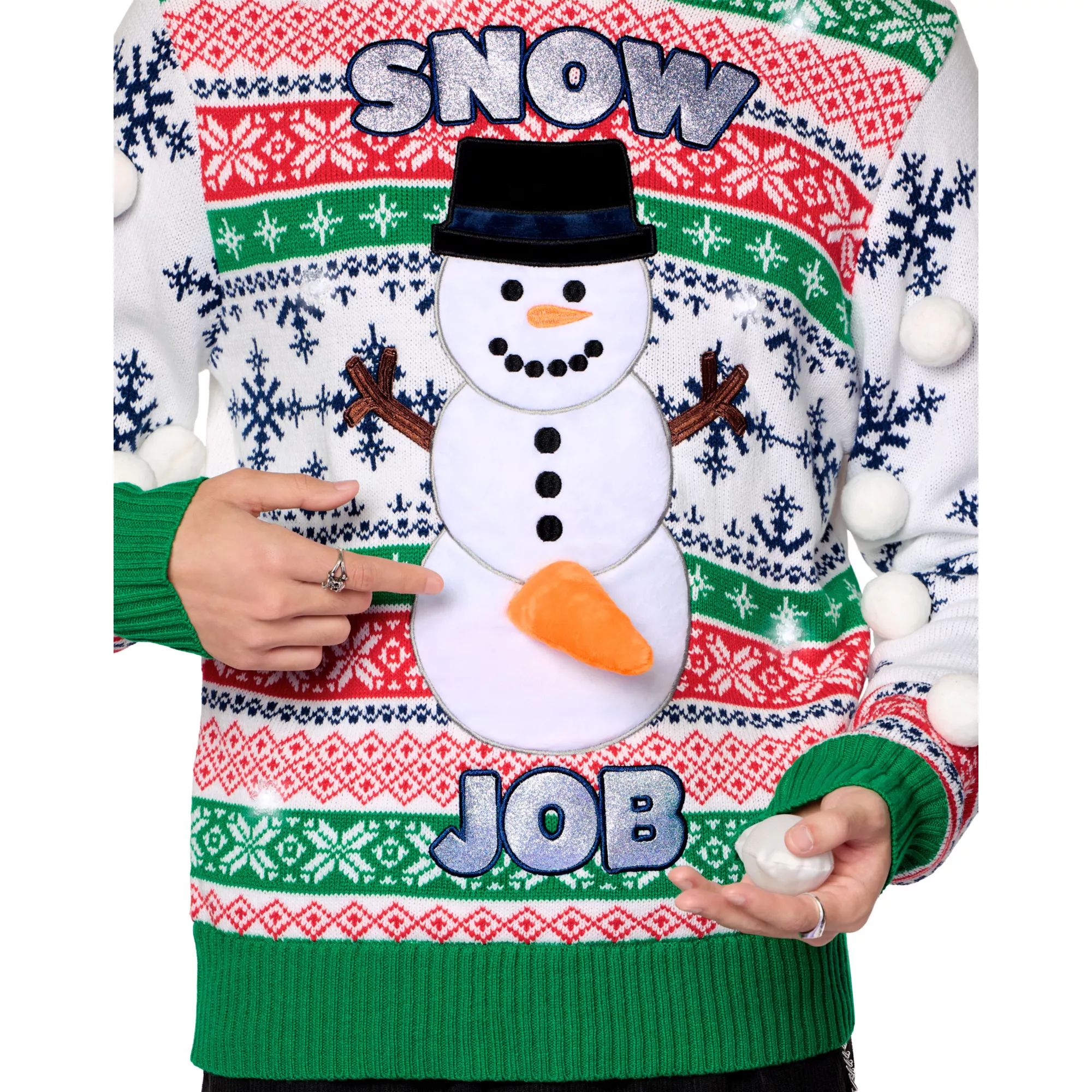 You'll be sure to land yourself on the naughty list this Christmas when you wear this hilarious Snow Job Christmas Sweater. Featuring a cheeky Snowman on the front with an inflatable carrot pecker, wear this Christmas sweater to your next holiday party and everyone will know a good old fashioned snow job is on your Christmas list.