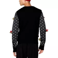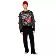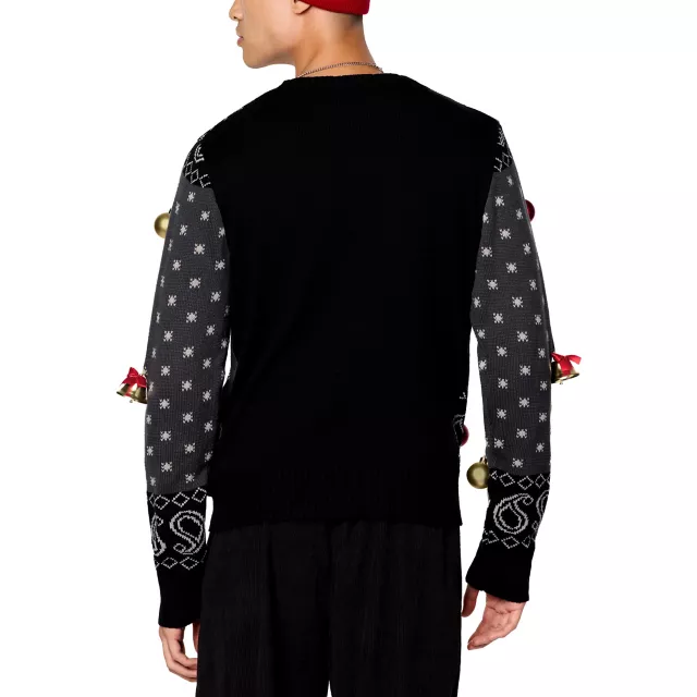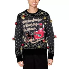 Have a Doggy Dog Christmas in this officially licensed Light-Up Uncle Snoop Is Coming to Town Christmas Sweater! This festive sweater features your favorite uncle on a sleigh ride with his best Dogg! Adorned with red and gold Christmas ornaments, gold bells with red bows, and featuring three light flashing modes, this sweater is perfect for a lit holiday season.