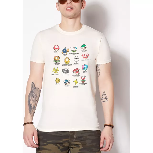 Watch out for fire flowers and dangerous shells! This Mario Kart t shirt features a guide to the game's many graphics. This soft cotton graphic tee makes a great gift for your favorite gamer.
