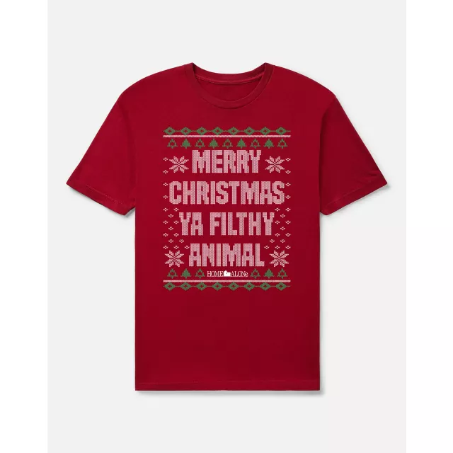 Ring in some holiday cheer with this officially licensed Merry Christmas Ya Filthy Animal T Shirt, designed with a vintage, Christmas sweater pattern. Featuring the iconic “Merry Christmas Ya Filthy Animal” line from Home Alone 2: Lost in New York, this graphic tee brings a little Kevin-in-the-city nostalgia to your holiday wardrobe.
