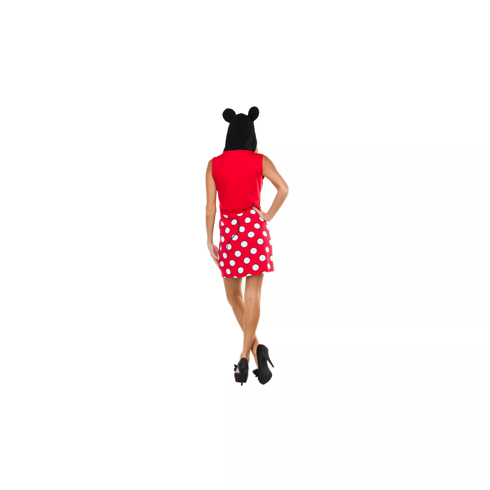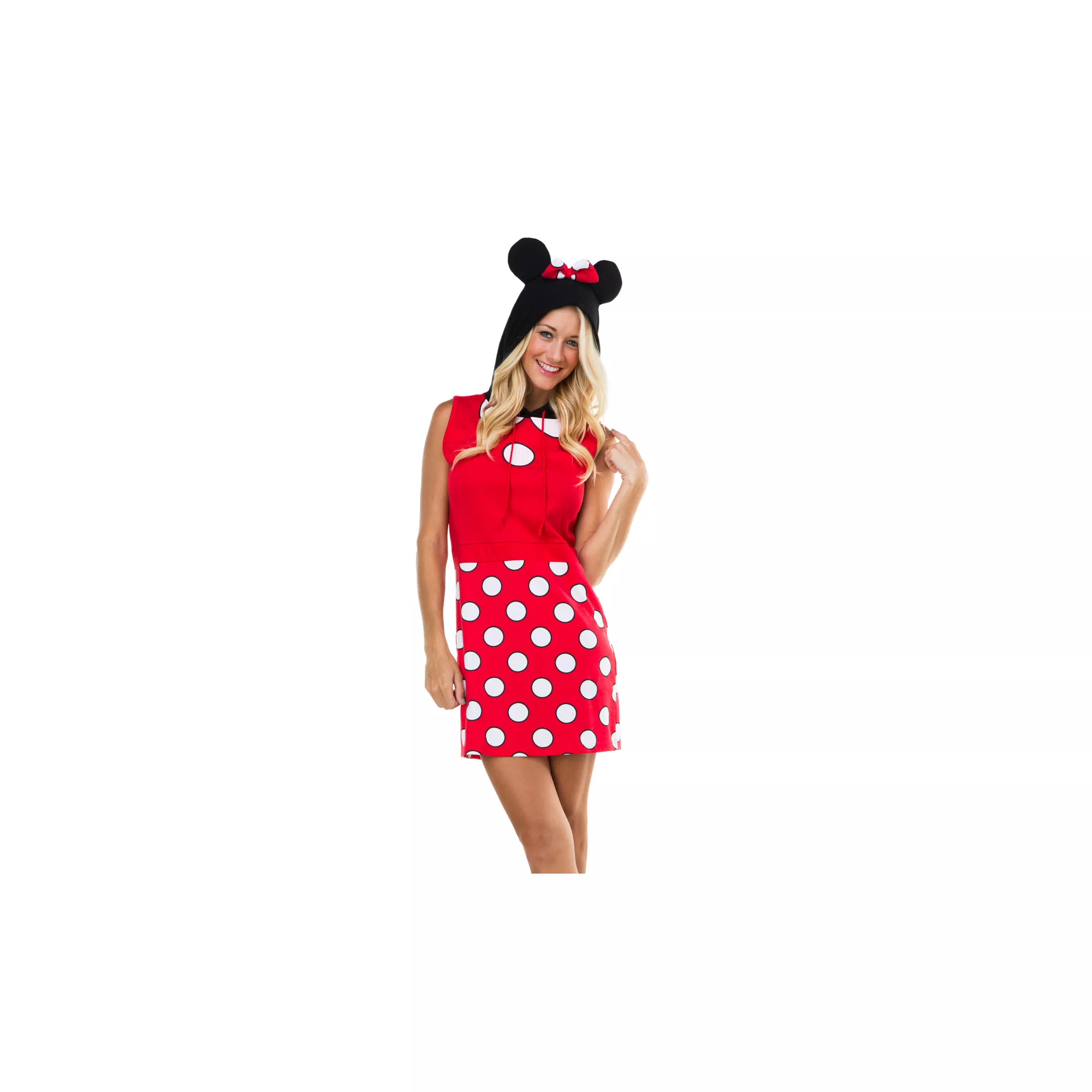 Perk up Halloween in the Officially Licensed Minnie Mouse Hood Dress. This super comfortable dress features white polka dots, graphic button detail and adorable mouse eared hood.