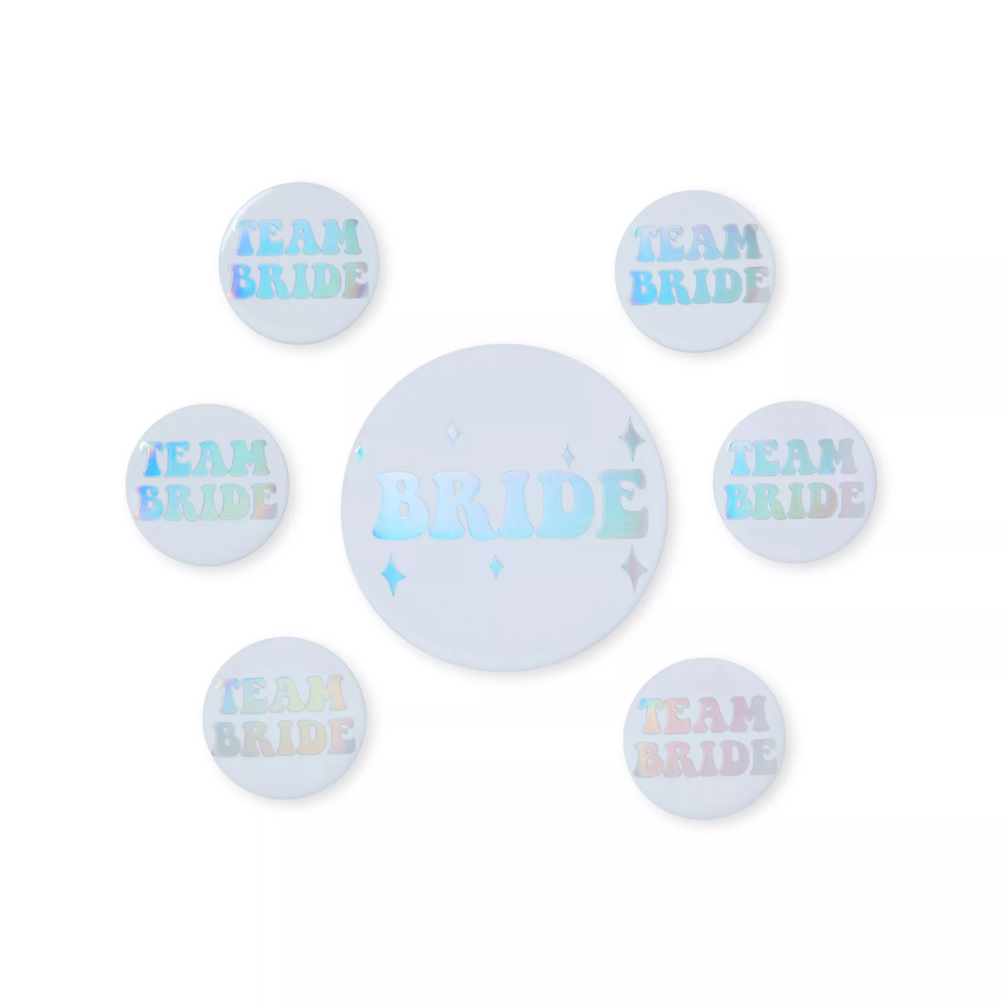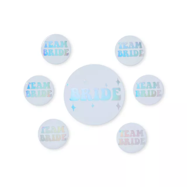 We're #teambride all the way. Show some love for your favorite bestie bride in these Multi-Colored Team Bride Pins. This pin pack features seven multi-colored "team bride" pins, perfect for bachelorette parties!