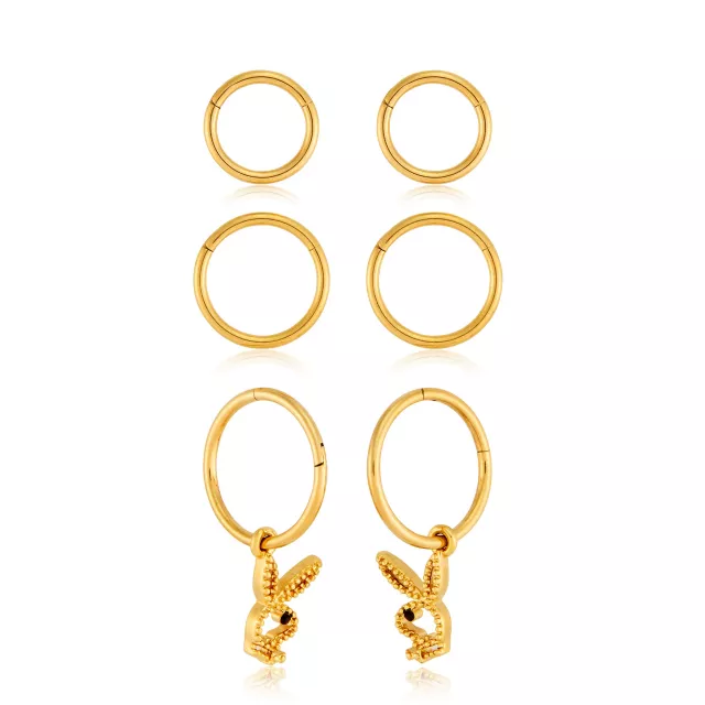 Multi-Pack Black CZ Goldtone Playboy Pendant Hoop Earrings 3 Pair - 16 Gauge
