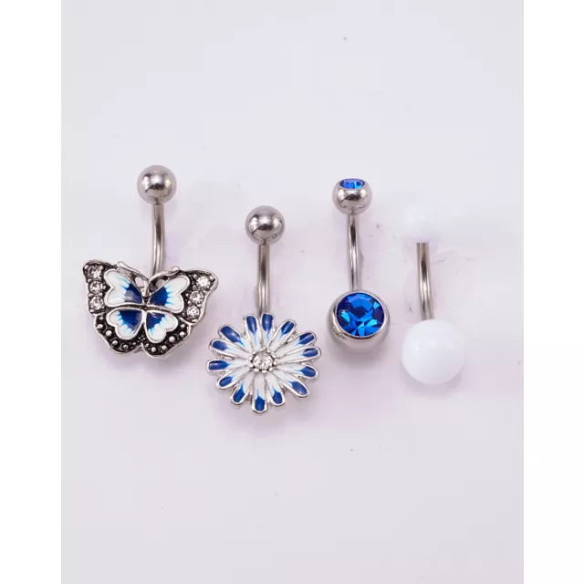Multi-Pack Blue CZ Butterfly and Flower Belly Rings 4 Pack - 14 Gauge
