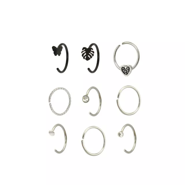 Multi-Pack CZ Black and Silvertone Butterfly Ribcage Heart Hoop and Half Hoop Nose Rings 9 Pack - 20 Gauge