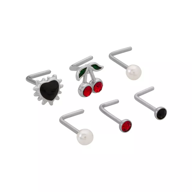 Multi-Pack CZ Cherry and Heart L-Bend Nose Rings 6 Pack - 20 Gauge