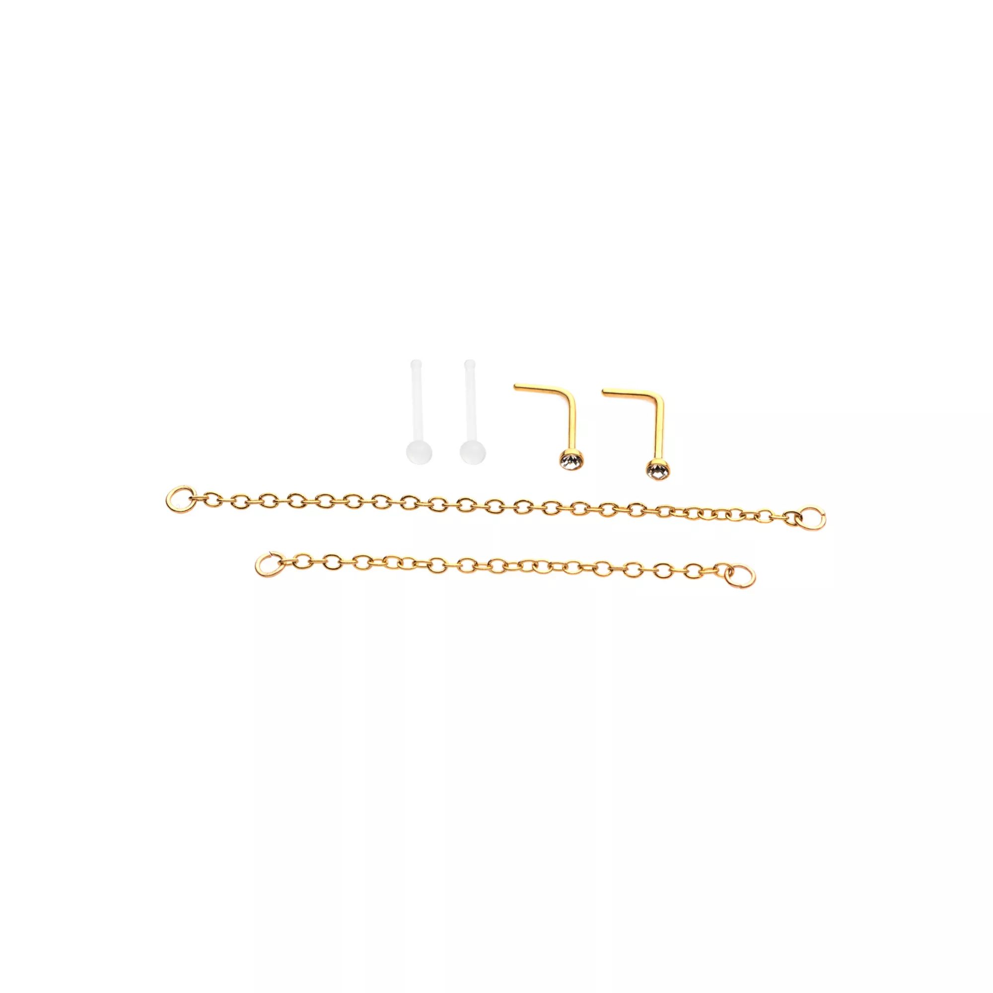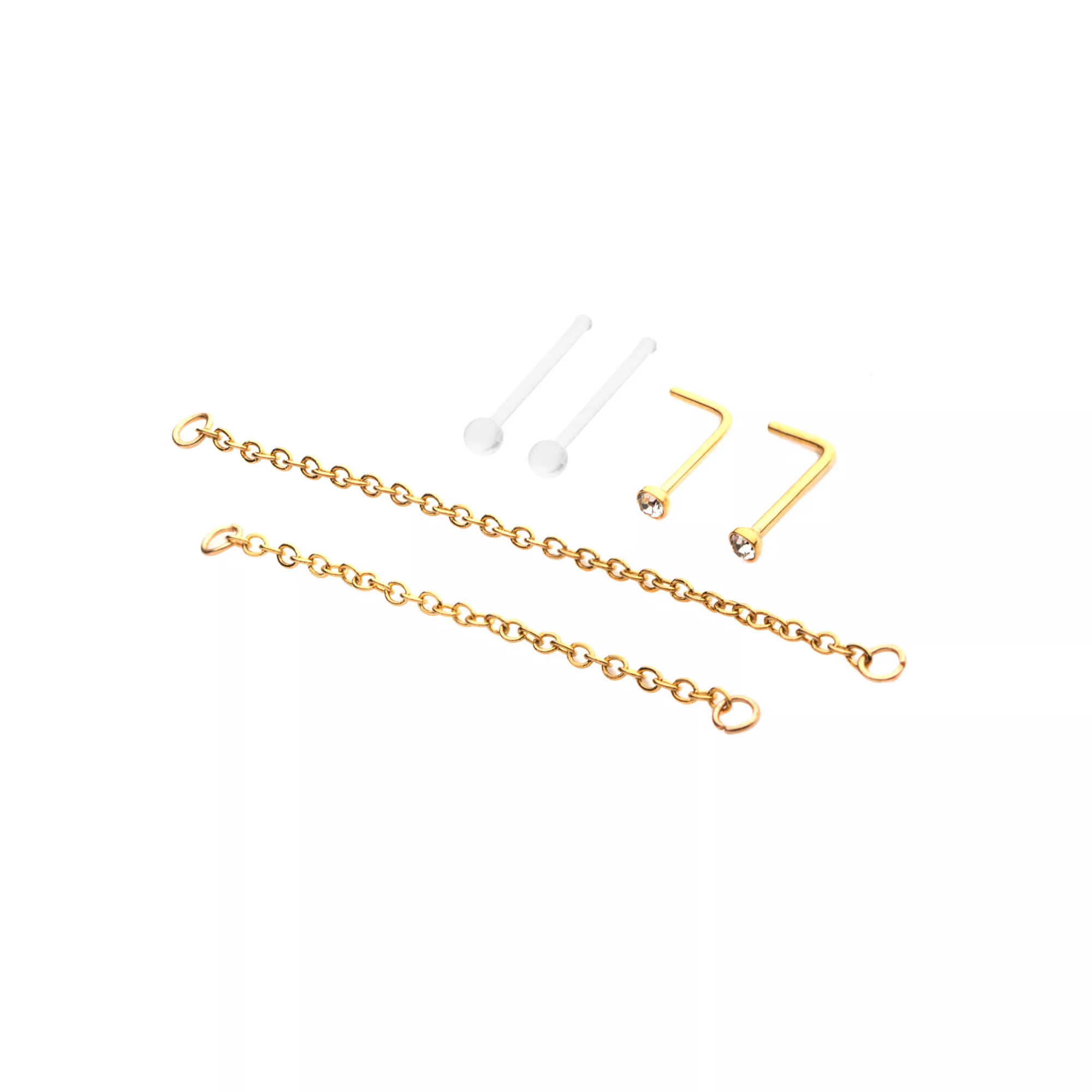 Multi-Pack CZ Goldplated L-Bend Nose Rings and Nose Chains 2 Pair - 18 Gauge