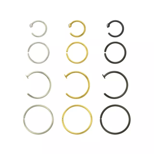 Multi-Pack CZ Goldtone and Black Hoop Nose Rings and Half Hoop Nose Rings 12 Pack - 20 Gauge