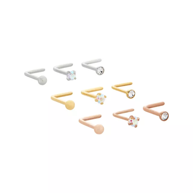 Multi-Pack CZ Goldtone and Rose Goldtone L-Bend Nose Rings 9 Pack - 20 Gauge