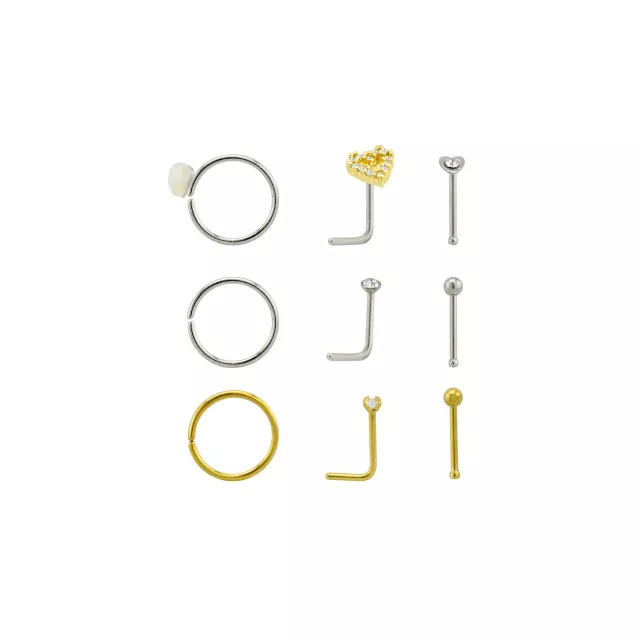 Multi-Pack CZ Goldtone and Silvertone Heart Nose Rings 9 Pack - 20 Gauge