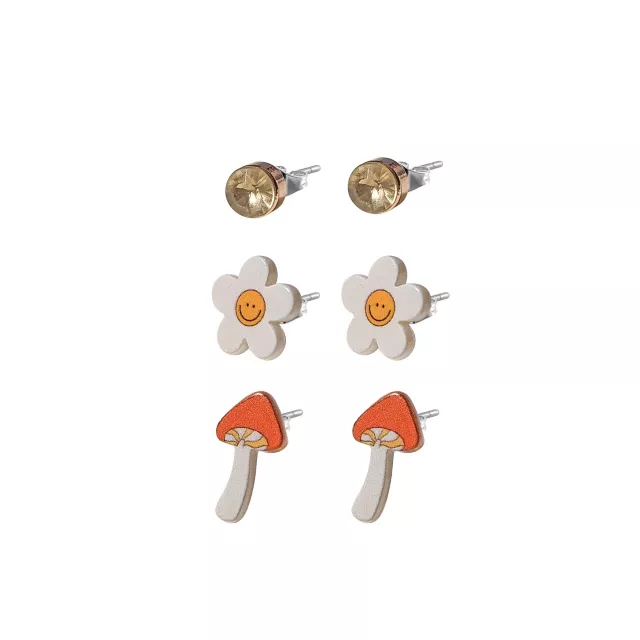Multi-Pack CZ Happy Flower and Mushroom Stud Earrings- 3 Pair