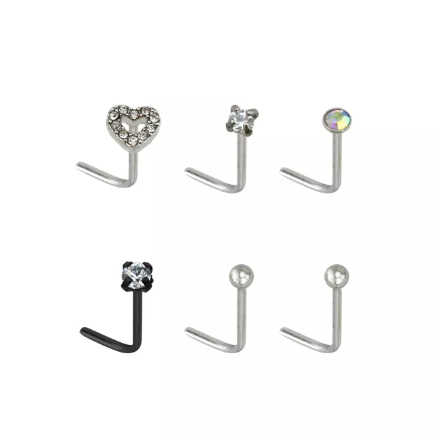 Multi-Pack CZ Heart L-Bend Nose Rings 6 Pack - 20 Gauge