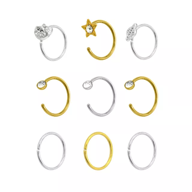 Multi-Pack CZ Moon and Star Hoop Nose Rings 9 Pack - 20 Gauge