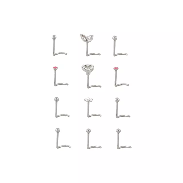 Multi-Pack CZ Multi-Color Butterfly Heart Flower Screw Nose Rings 12 Pack - 20 Gauge