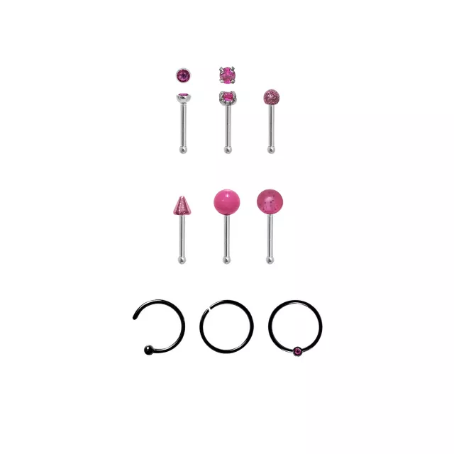 Multi-Pack CZ Pink Nose Pins and Hoop and Half Hoop Nose Rings 9 Pack - 20 Gauge