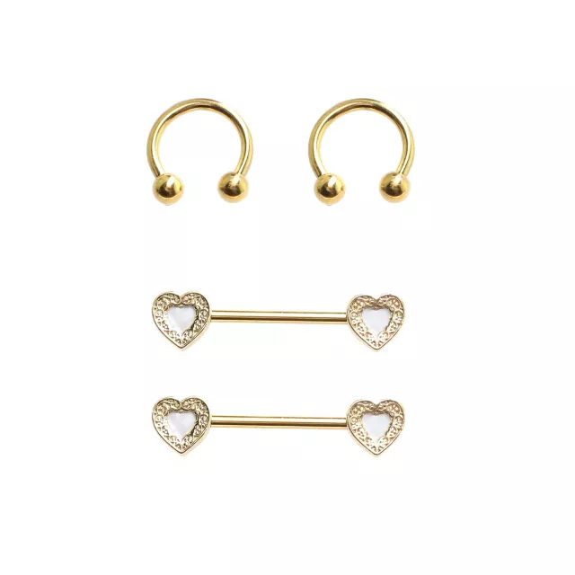 Multi-Pack Gold-Plated Heart Nipple Barbells and Horseshoe Rings 2 Pair - 14 Gauge