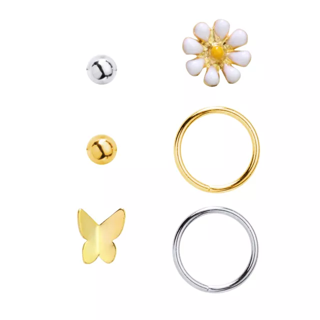 Multi-Pack Goldtone Butterfly Nose Pins and Hoop Nose Rings 6 Pack - 20 Gauge