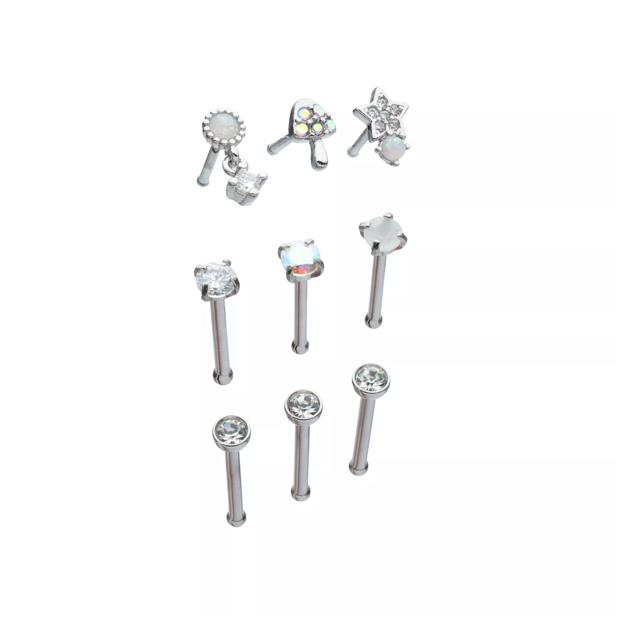 Multi-Pack Multi-Color CZ Mushroom and Star Bone Nose Rings 9 Pack - 20 Gauge