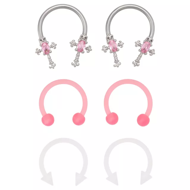 Multi-Pack Pink CZ Cross Acrylic and Silver-Tone Horseshoe Rings 3 Pair - 16 Gauge