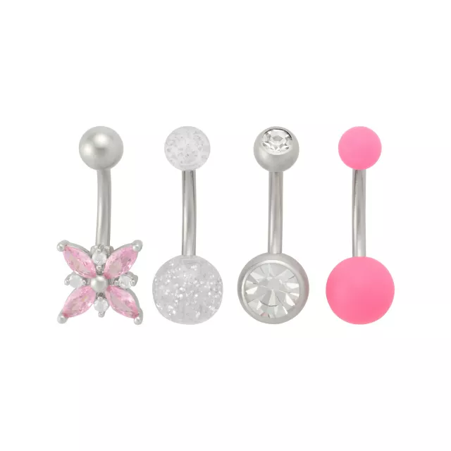 Multi-Pack Pink CZ Flower Glitter Belly Rings 4 Pack - 14 Gauge