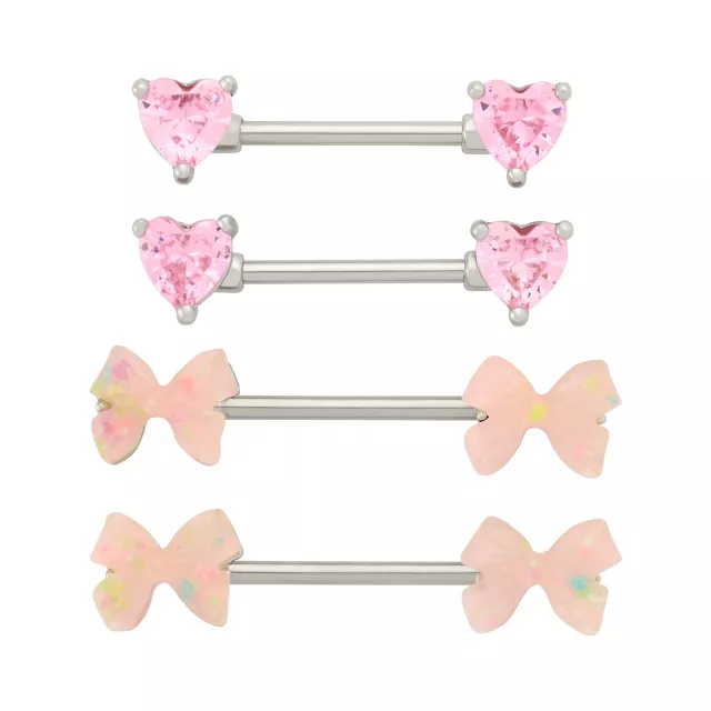 Multi-Pack Pink CZ Heart and Bow Silver-Tone Nipple Barbells 2 Pair - 14 Gauge