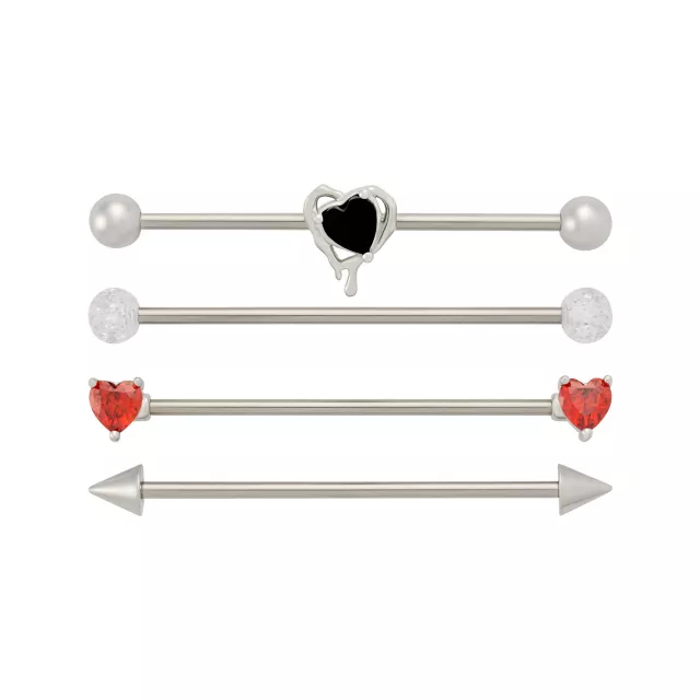 Multi-Pack Red and Black CZ Drip Heart Silver-Tone Titanium Industrial Barbells 4 Pack - 14 Gauge