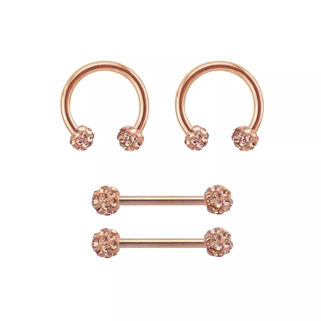 Multi-Pack Rose Goldtone Pave Nipple Barbells and Horseshoe Rings 2 Pair - 14 Gauge