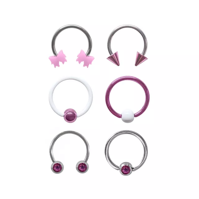 Multi-Pack Silvertone and Purple Horseshoe Rings and Captive Rings 6 Pack - 16 Gauge