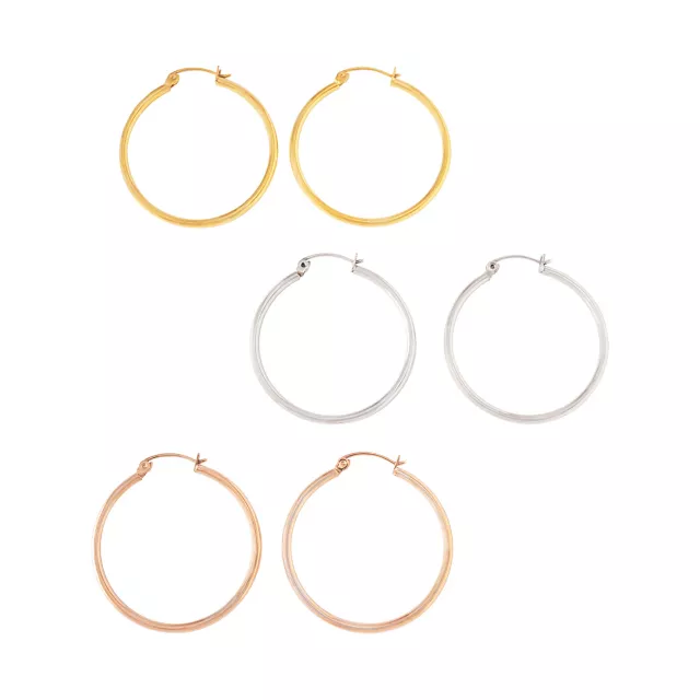 Multi-Pack Silvertone Goldplated and Rose Goldplated Hoop Earrings 3 Pairs - 20 Gauge