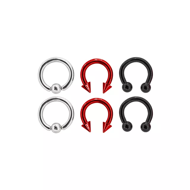 Multi-Pack Silvertone Red and Black Captive Bead Rings and Horseshoe Rings 6 Pack - 10 Gauge