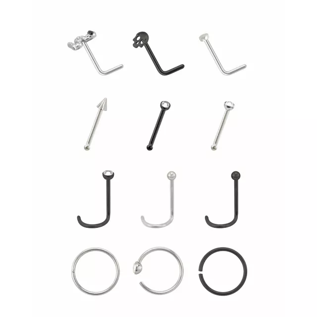 Multi-Pack Skull Pin Hoop and L-Bend Nose Rings 12 Pack - 20 Gauge