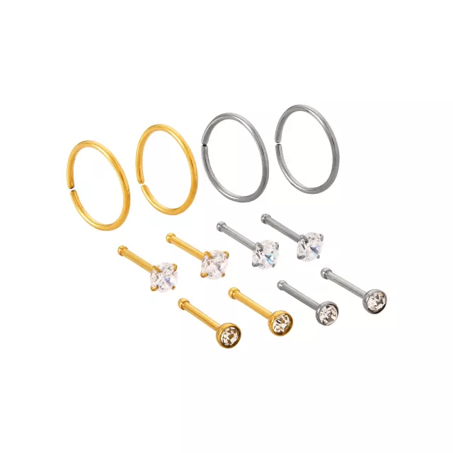 Multi-Pack Titanium Silvertone and Goldtone Nose Hoops and Nose Pins 12 Pack - 20 Gauge