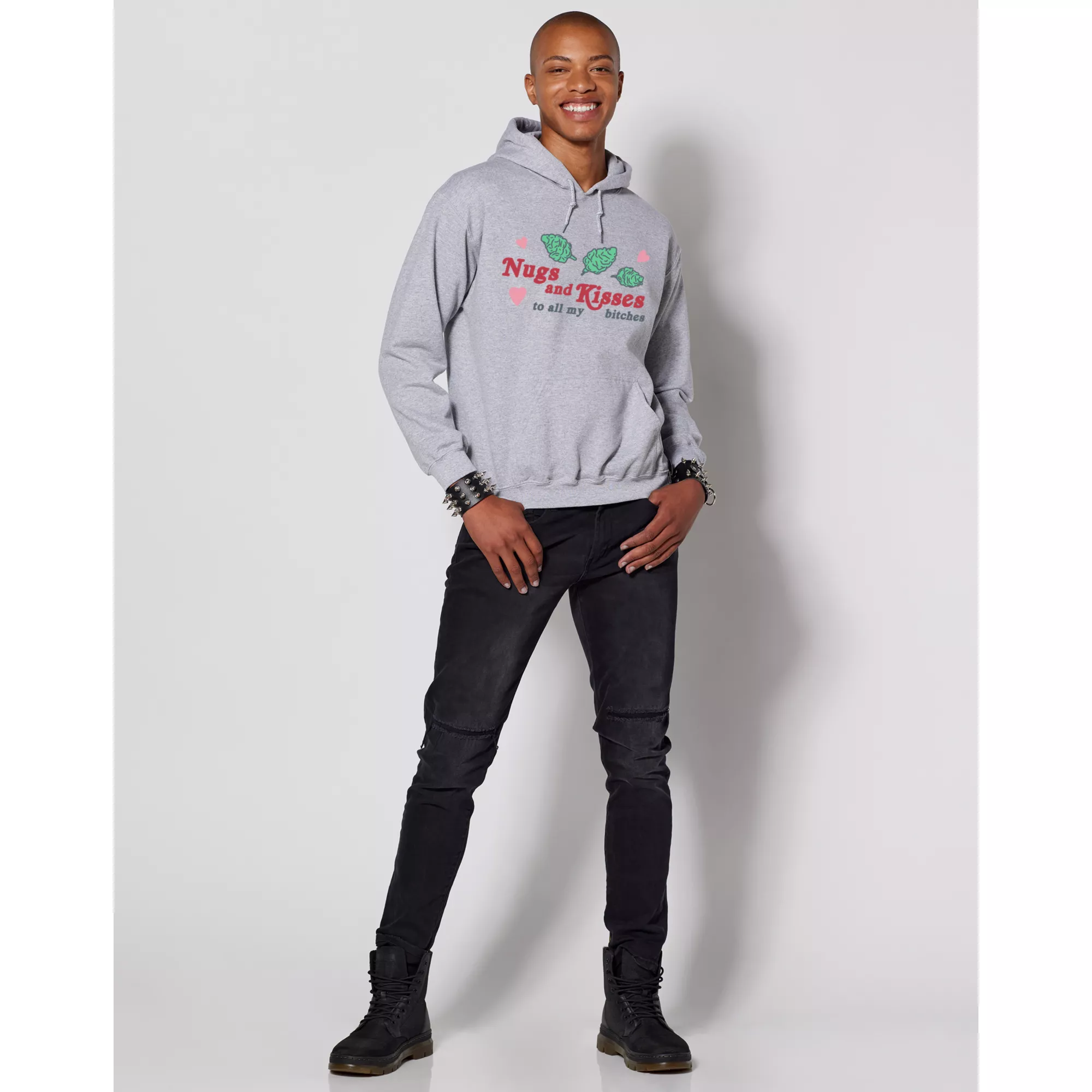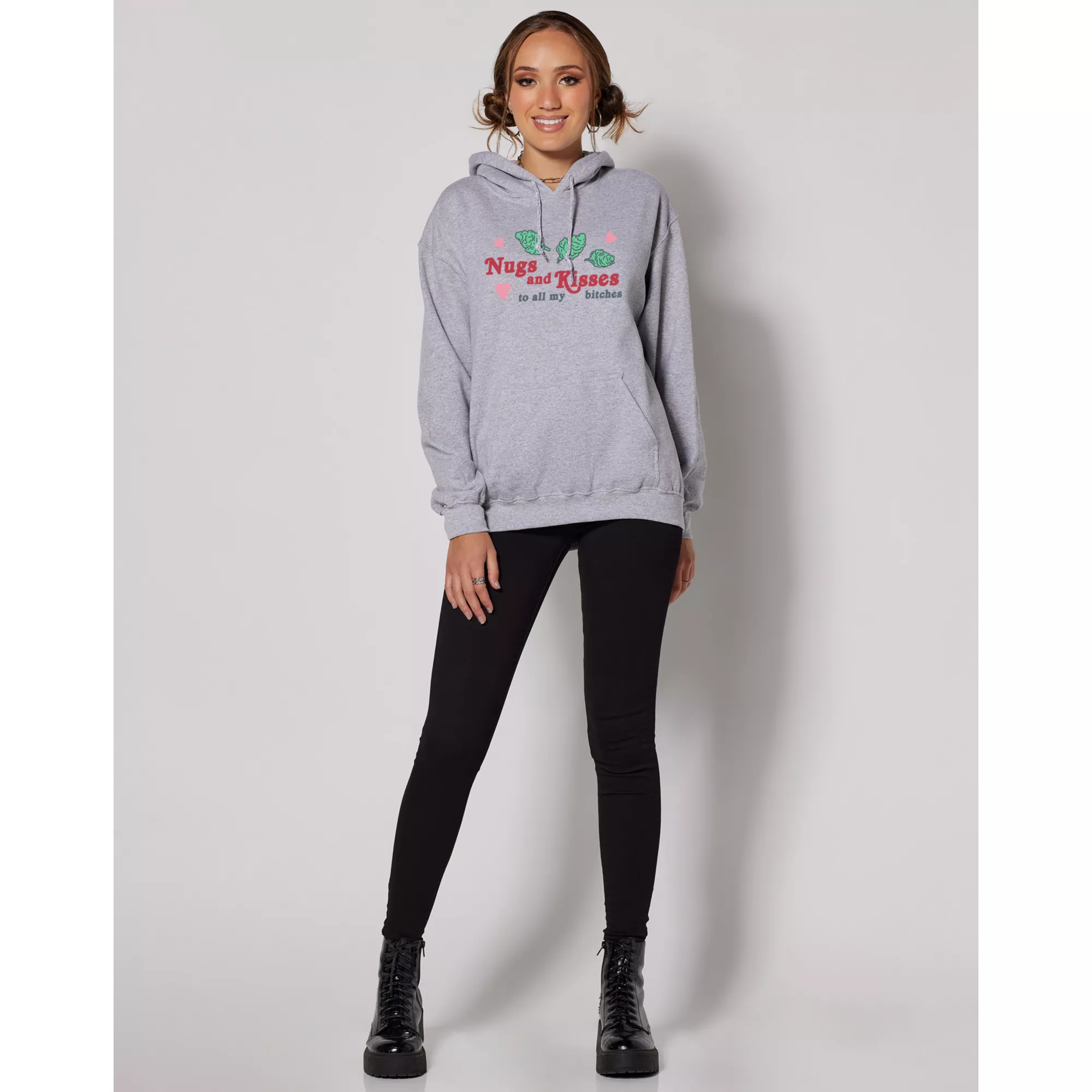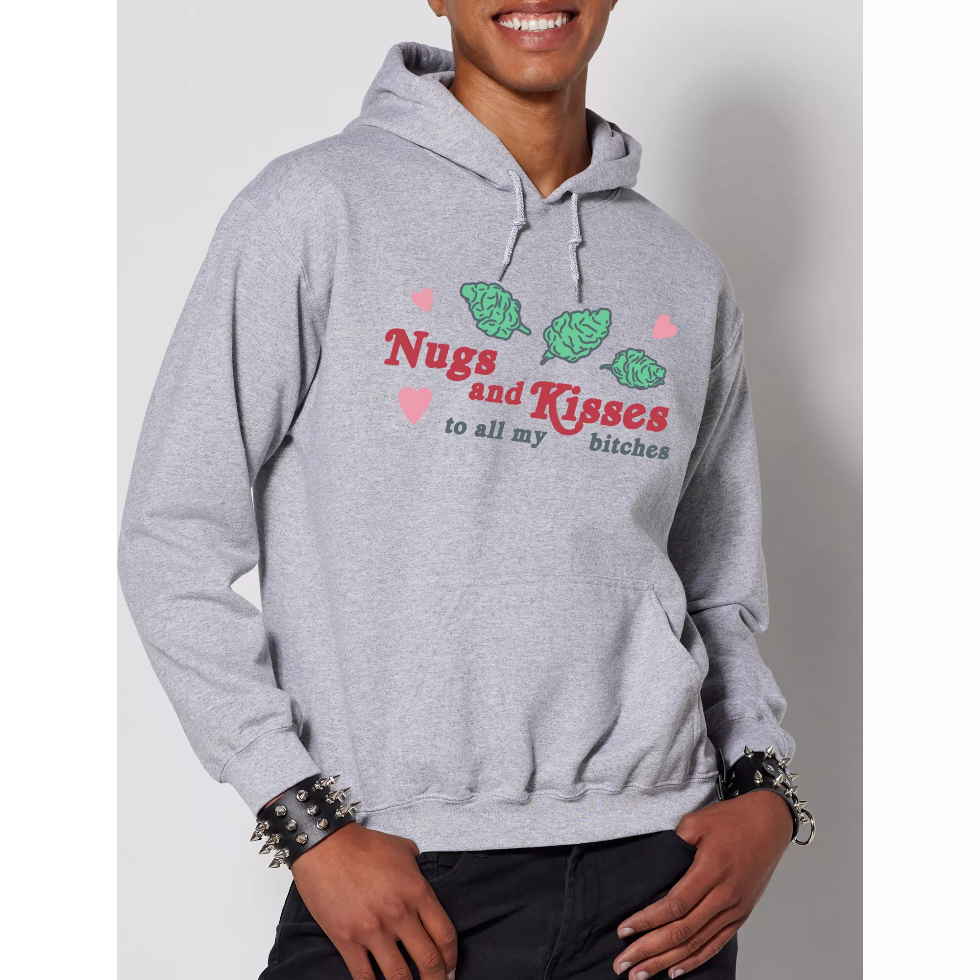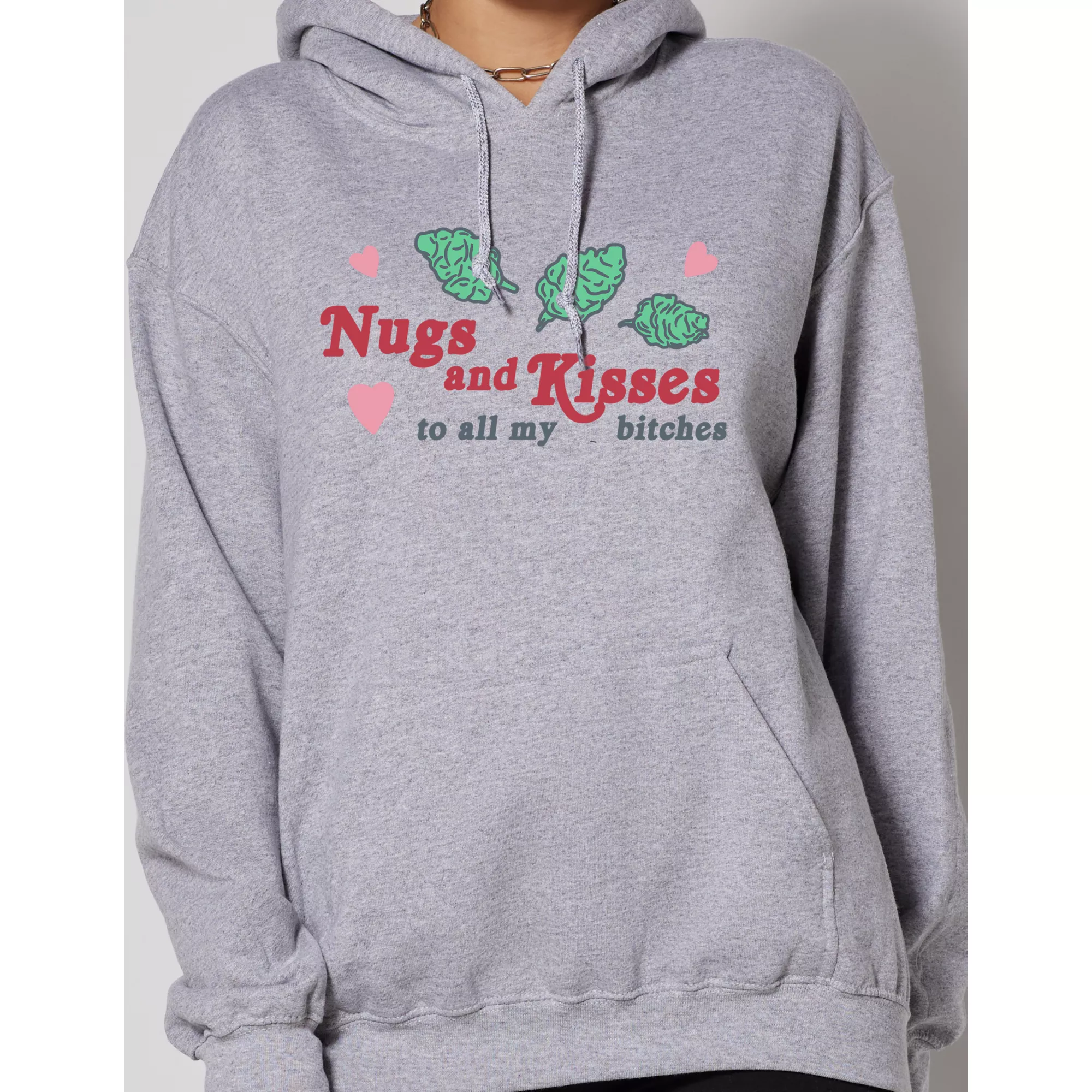 Shower your loved ones with nugs and kisses. This cozy gray hoodie is perfect for lounging around, snacking, and lounging around some more.