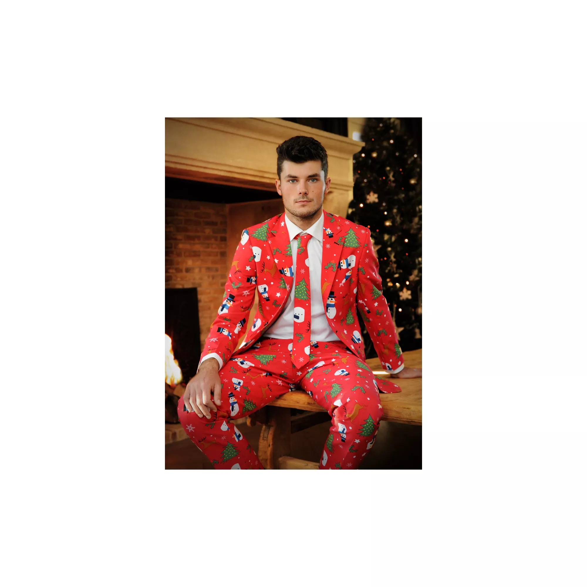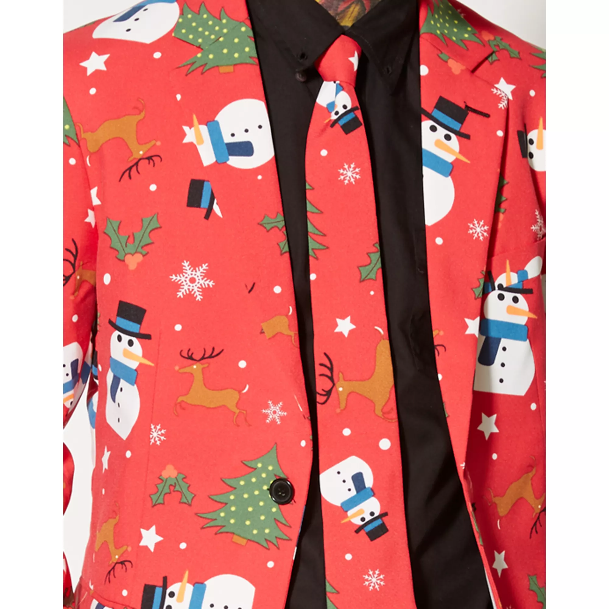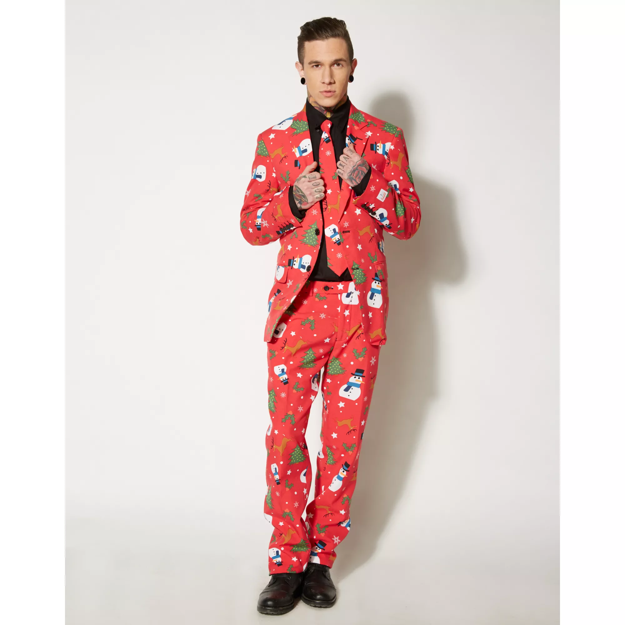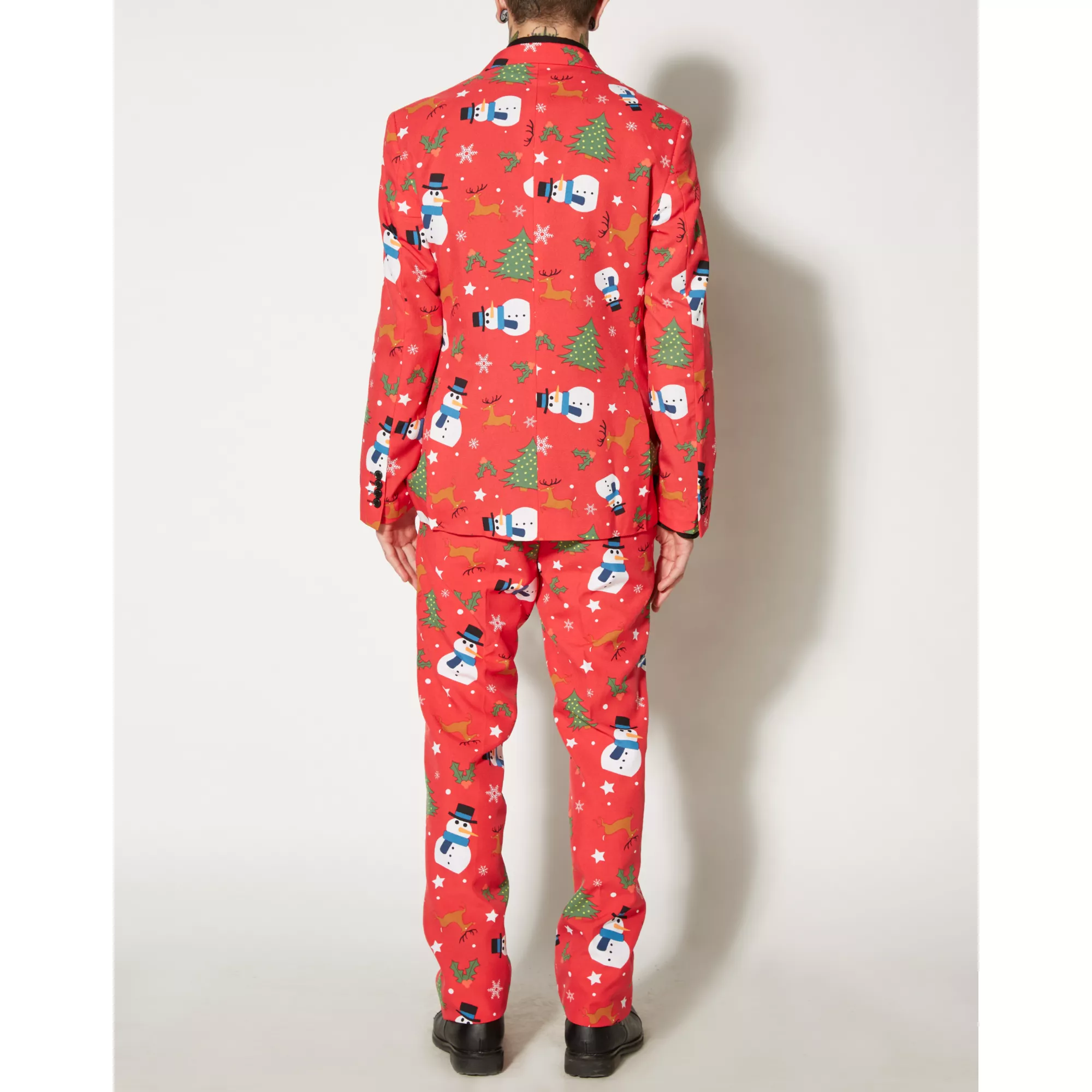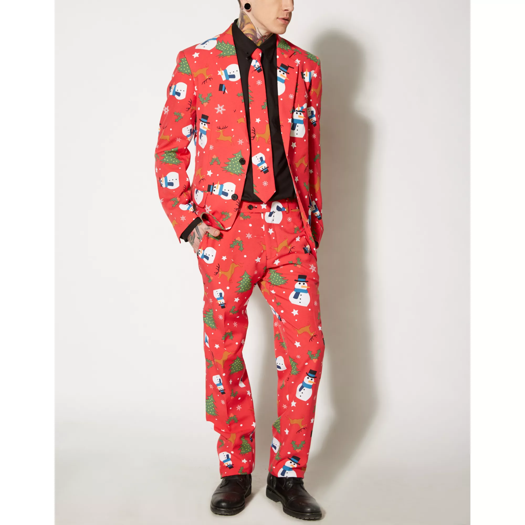 This Christmas will be a very dapper Christmas, indeed, with The Christmaster Party Suit! This festive suit outshines Santa and the elves with its multiple pockets and luxurious purple lining. This red jacket, pants and tie combo features snowmen, trees, and reindeer print that begs to rock around the Christmas tree! Pants come with 1.5 inches of extra material at the seam, so they can be perfectly tailored to your body.