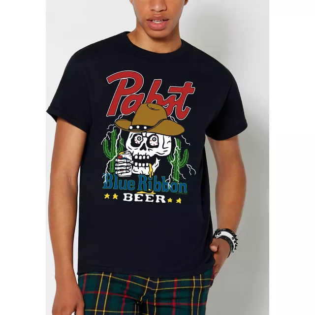 Hit the town and crack open a cold one in this Pabst Blue Ribbon Cowboy Skull T Shirt. This stylish tee is a hilarious way to add some personality to any casual look and is sure to make some heads turn on your journey.