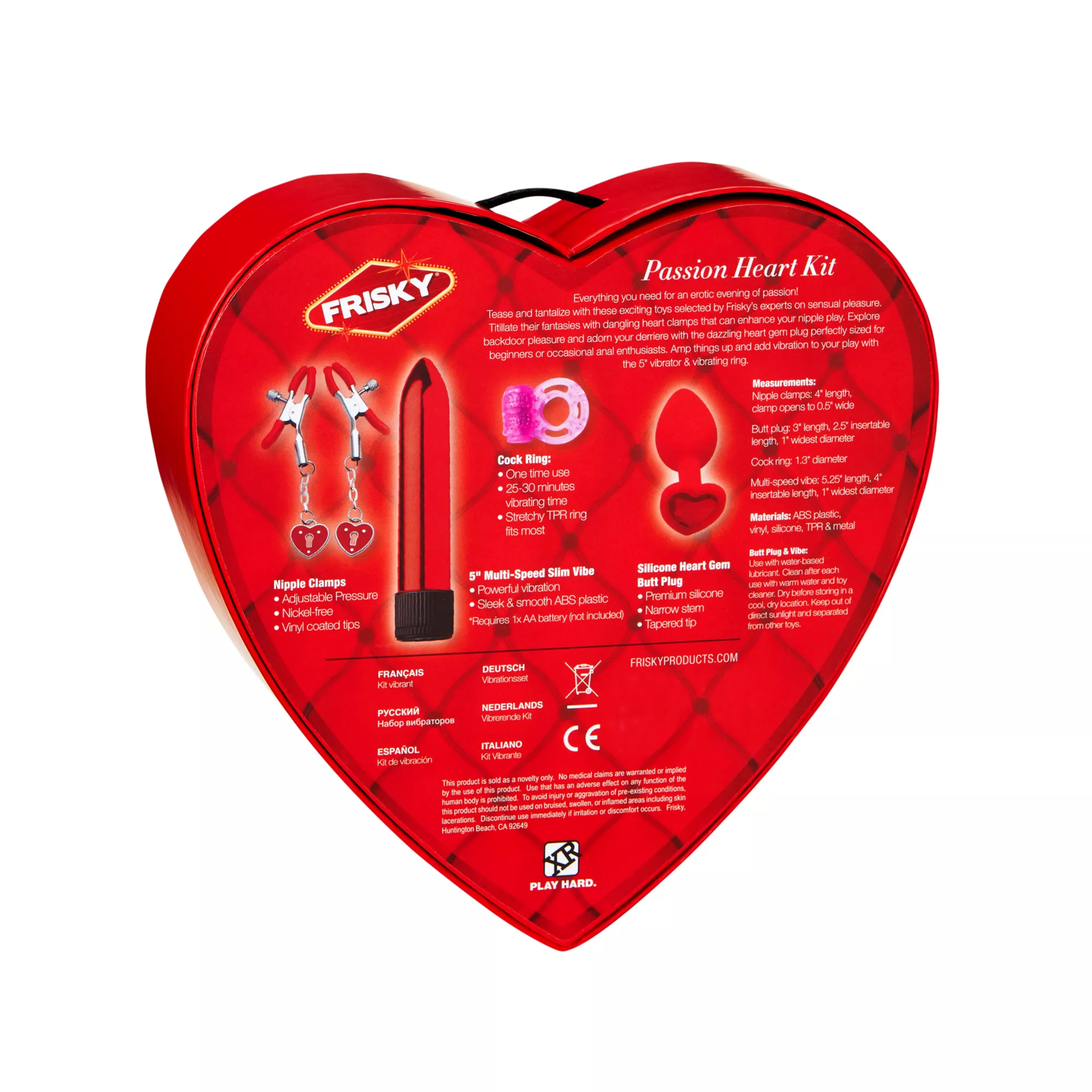 Exploring your every inner desire in the bedroom has never been easier than with this Passion Heart Sex Toy Kit. No matter what you're in the mood for this toy kit is sure to please your every want and need. Tease your partner with the included nipple clamps or tongue vibrator that's perfect for beginners or pros. Use the included butt plug or vibrator for some penetration and you'll be hitting the right spots all night long!