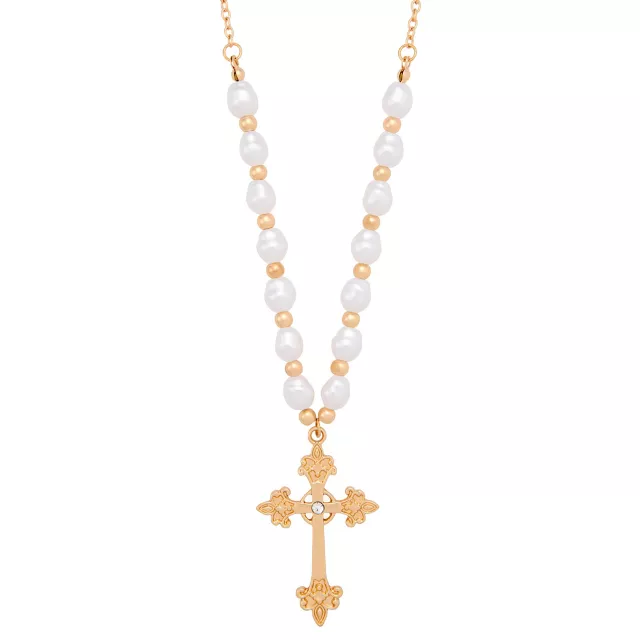 Pearl-Effect Cross Gold-Tone Necklace