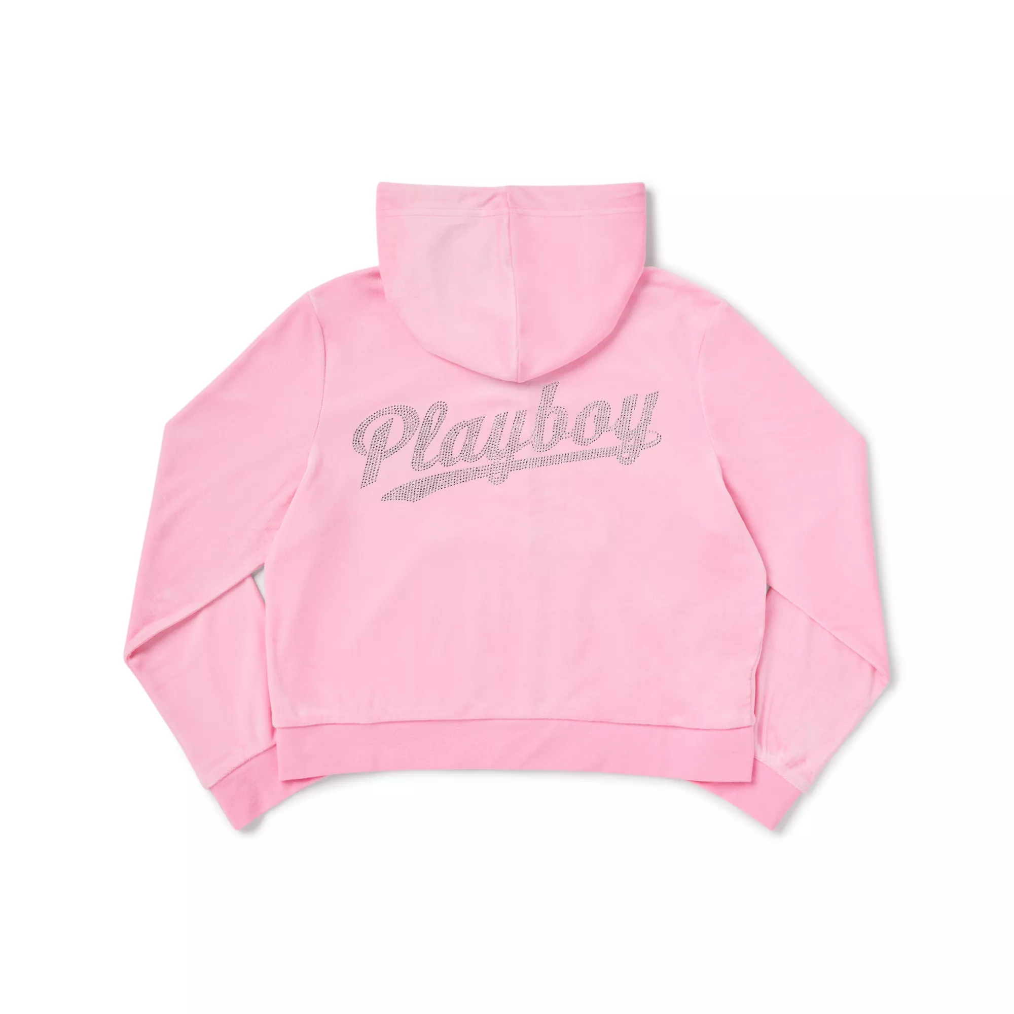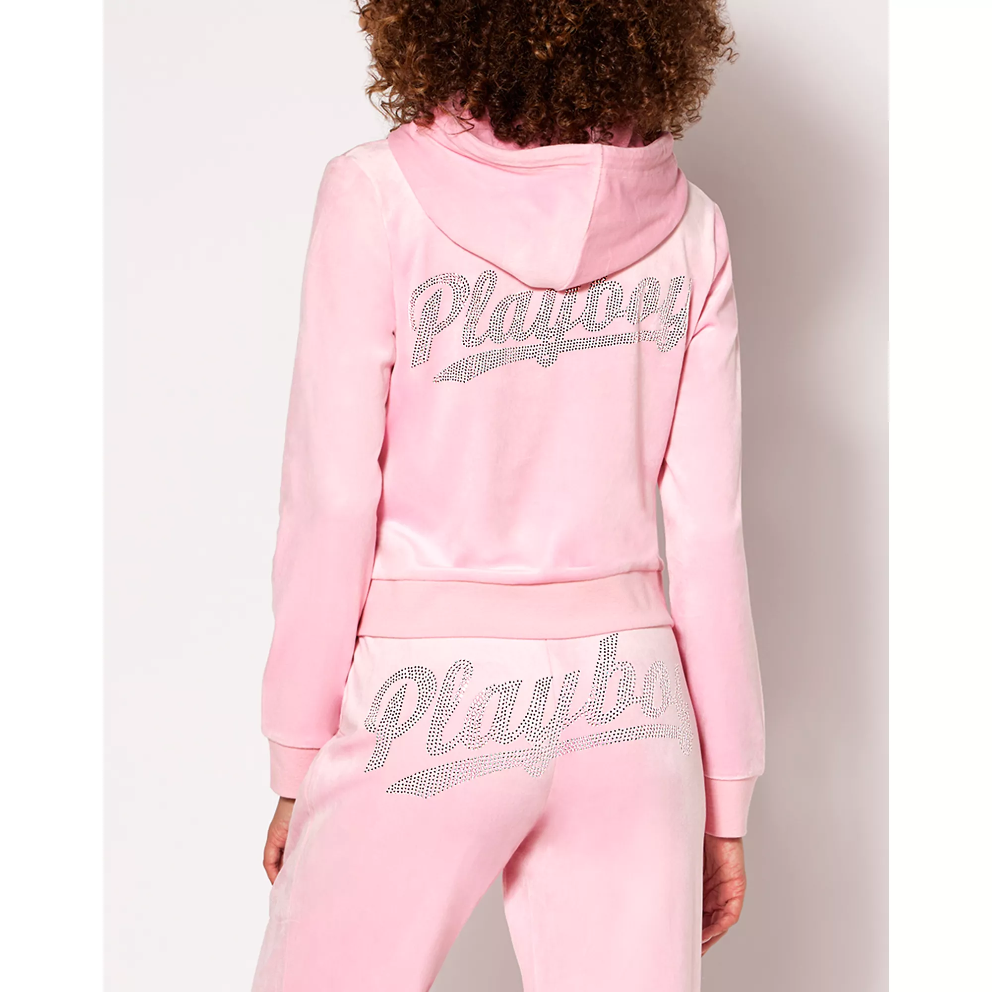 Live a life of playful luxury when you rock this officially licensed Pink Playboy Rhinestone Hooded Track Jacket. Featuring the brand's iconic name and bunny logo in rhinestone detailing, this soft and stylish top is absolutely stunning.