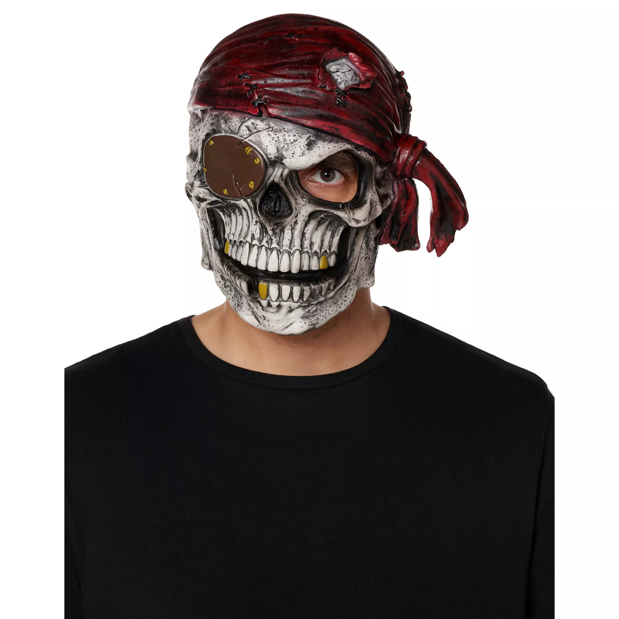 Yo-ho yo-ho, it's a pirate's life for you this Halloween! With this Pirate Skeleton full mask on you'll look just like a scurvy seadog in no time. This mask features an eyepatch and a red bandana on the head that looks so good even the Captain will want to sit down to grab some rum with you.