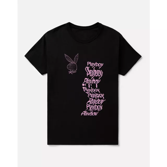 Put a trippy spin on your casual wear with this black Playboy Bunny wavy t shirt! With its pink writing in a variety of pink fonts and styles, this graphic tee is sure to make everyone look twice.